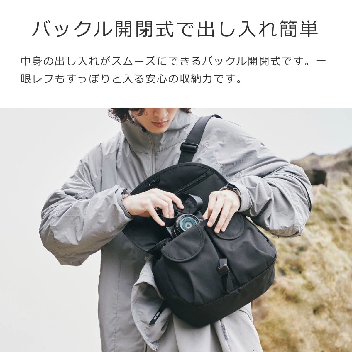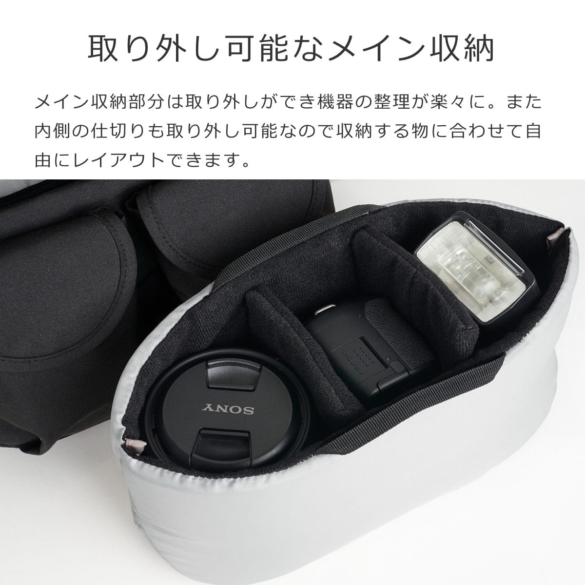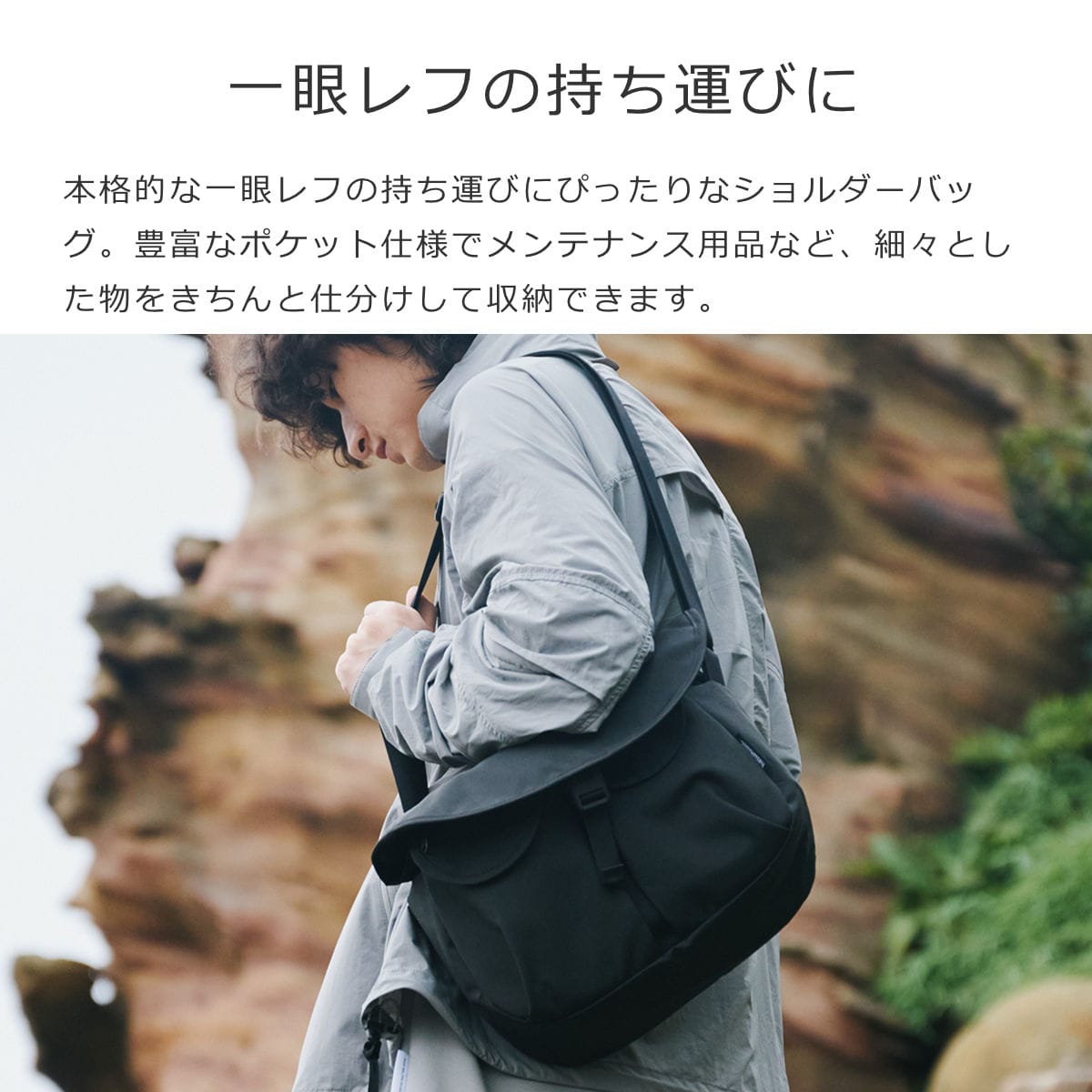 本格的な一眼レフカメラの持ち運びにぴったりなショルダーバッグです。豊富なポケット仕様でメンテナンス用品など、細々とした物もきちんと仕分けして収納できます。