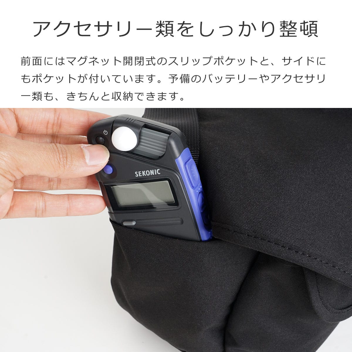 前面にはマグネット開閉式のスリップポケットと、サイドにもポケットが付いています。予備バッテリーやSDカード、メンテナンス用品など細かなアクセサリー類もきちんと収納できます。
