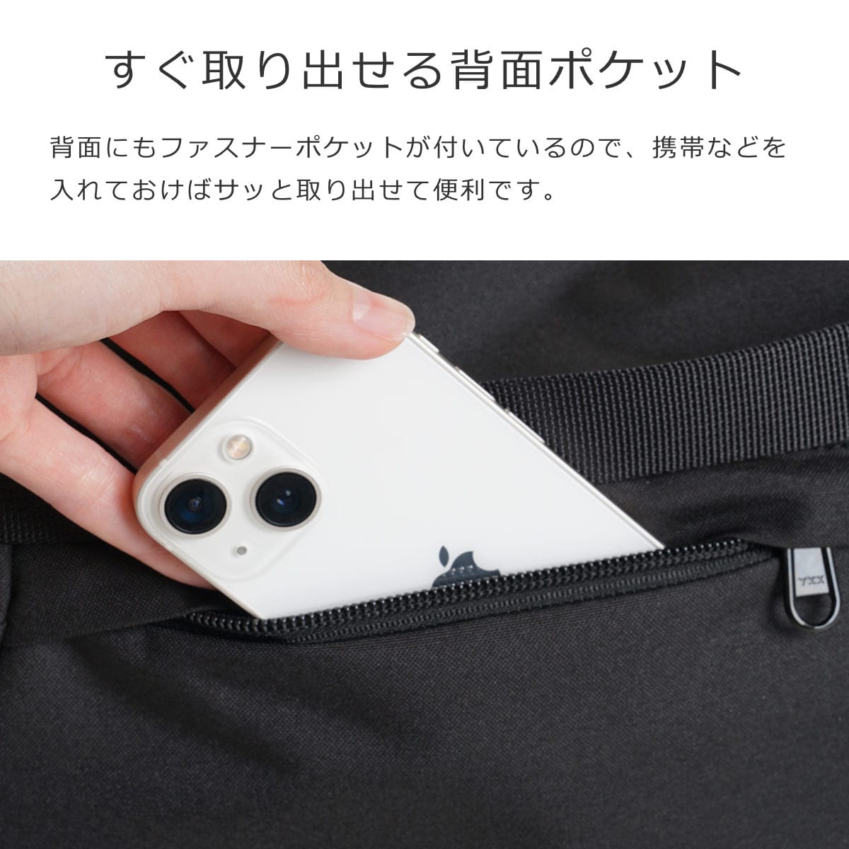 背面にもファスナーポケットが付いているので、携帯などを入れておけばサッと取り出せて便利です。