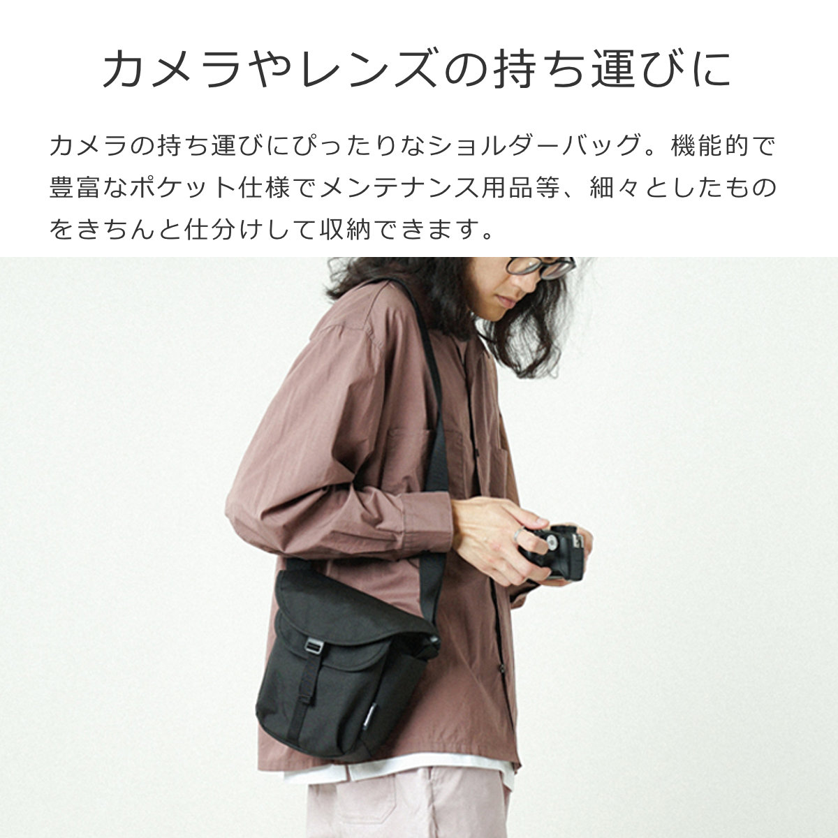 カメラの持ち運びにぴったりなショルダーバッグです。機能的で豊富なポケット仕様でメンテナンス用品等、細々としたものもきちんと仕分けして収納できます。身軽に持ち運べる使い勝手のいいサイズです。