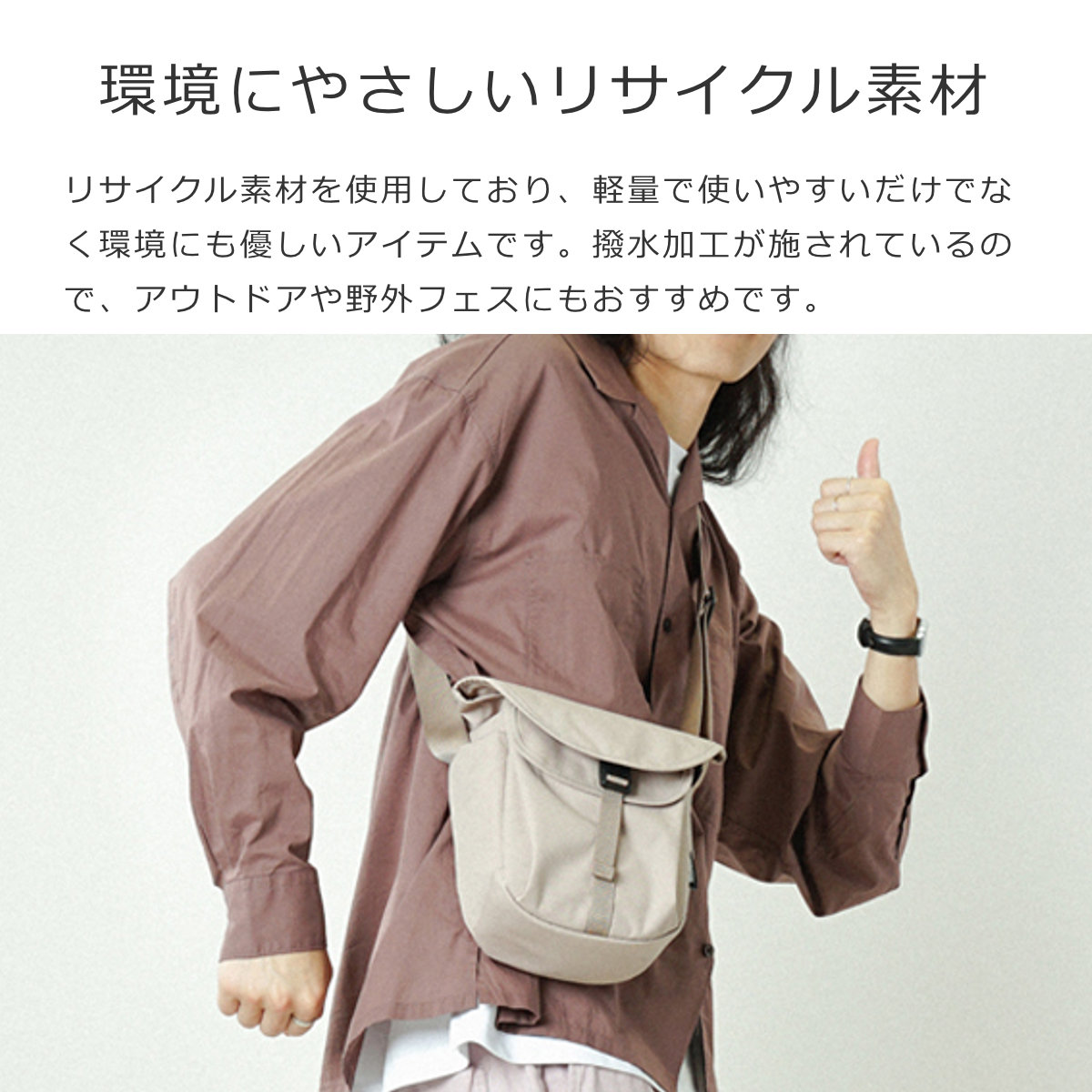 リサイクルしたポリエステル素材を使用しており、軽量で使いやすいだけでなく環境にも優しいアイテムになっています。撥水加工が施されているので、アウトドアや野外フェスにもおすすめです。
