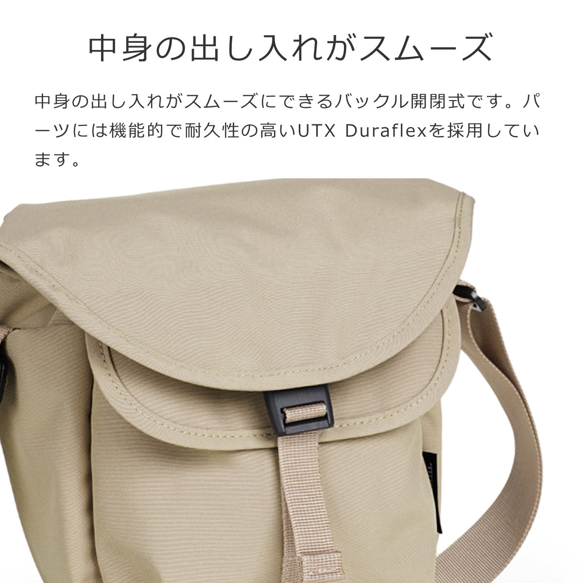 中身の出し入れがスムーズにできるバックル開閉式です。パーツには機能的で耐久性の高いUTX Duraflexを採用しています。