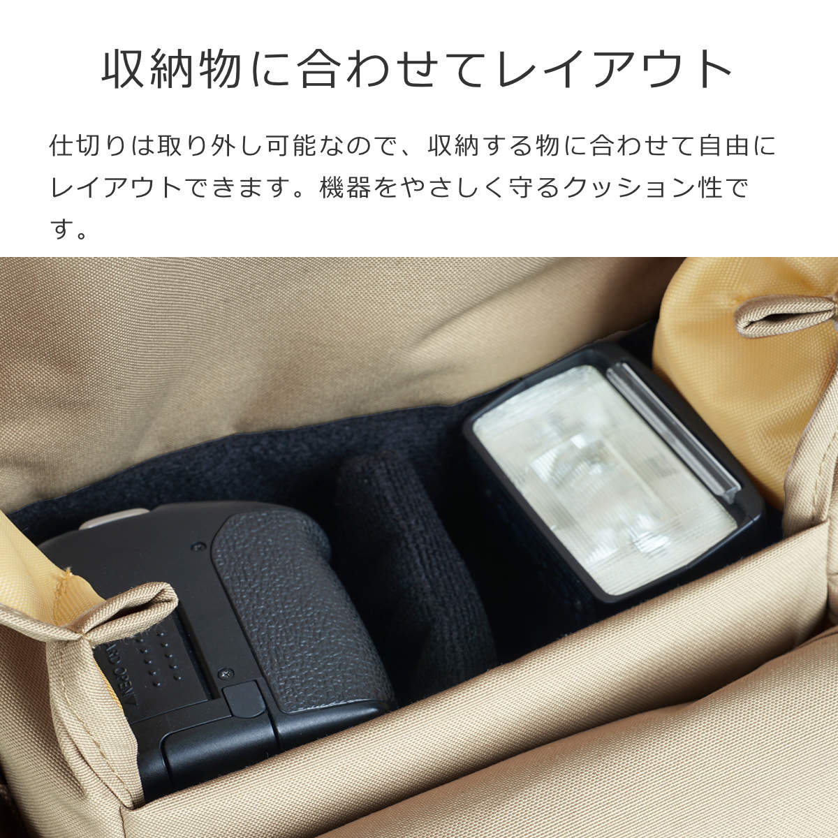 機器の接触を防ぐ内側の仕切りはやさしいクッション性。取り外し可能なので、収納する物に合わせて自由にレイアウトできます。