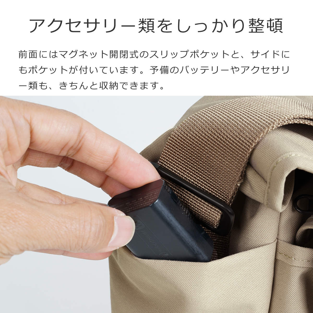 前面にはマグネット開閉式のスリップポケット、サイドには二つのポケットが付いています。予備バッテリーやSDカード、メンテナンス用品など細かなアクセサリー類もきちんと収納できます。
