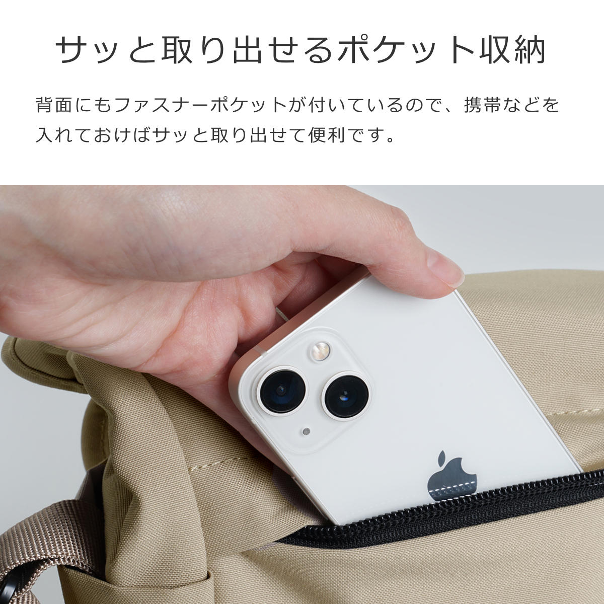背面にもファスナーポケットが付いているので、携帯などを入れておけばサッと取り出せて便利です。