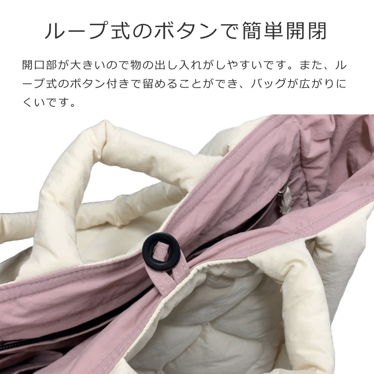 開口部が大きいので物の出し入れがしやすいです。また、ループ式のボタン付きで留めることができ、バッグが広がりにくいです。