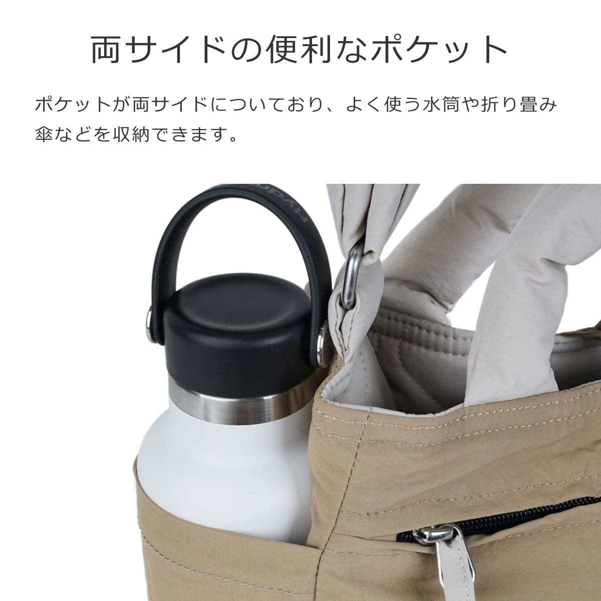 両サイドにあるポケットには、よく使う水筒や折り畳み傘を収納できます。