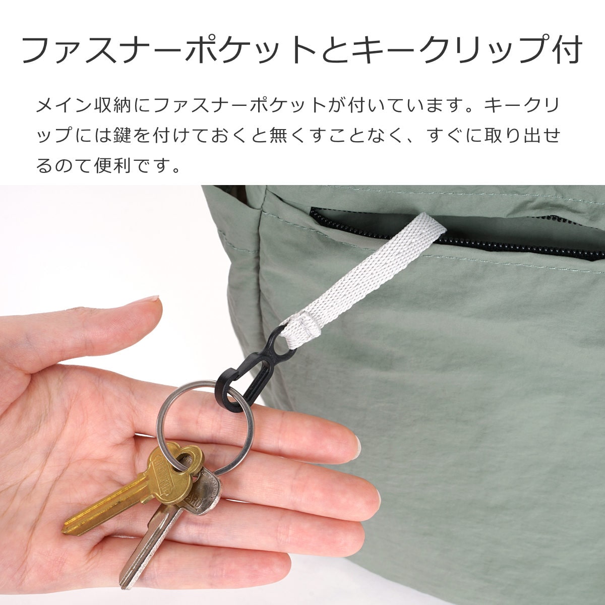 メイン収納にファスナーポケットが付いています。キークリップには鍵を付けておくと、すぐに取り出せて便利です。