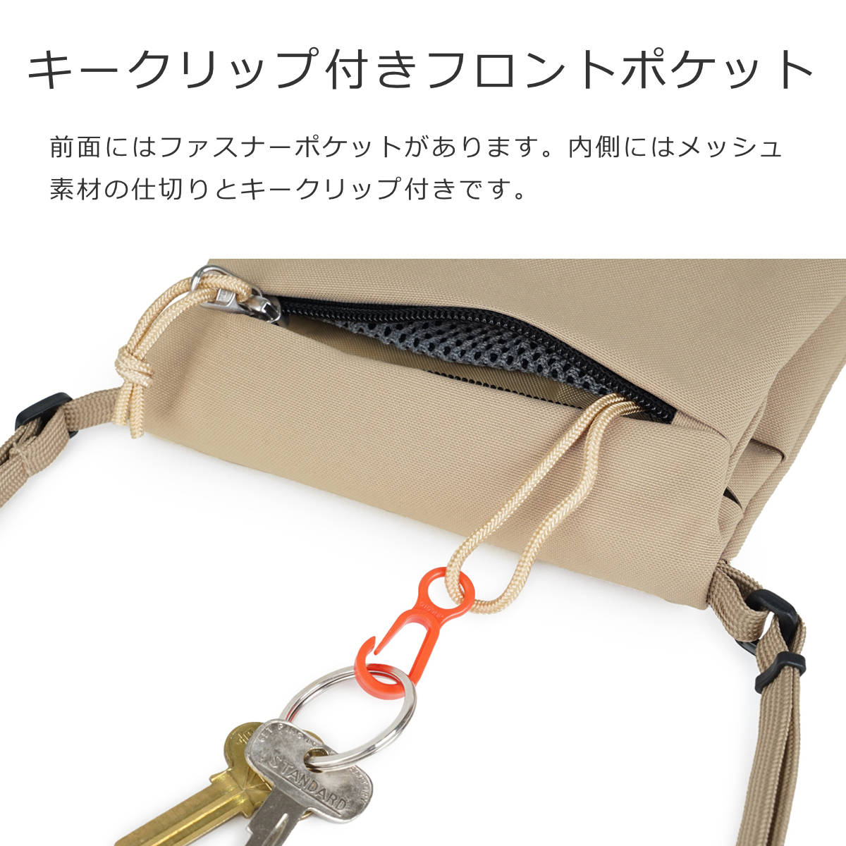 前面にはファスナーポケットがあります。内側にはメッシュ素材の仕切りとキークリップ付きです。