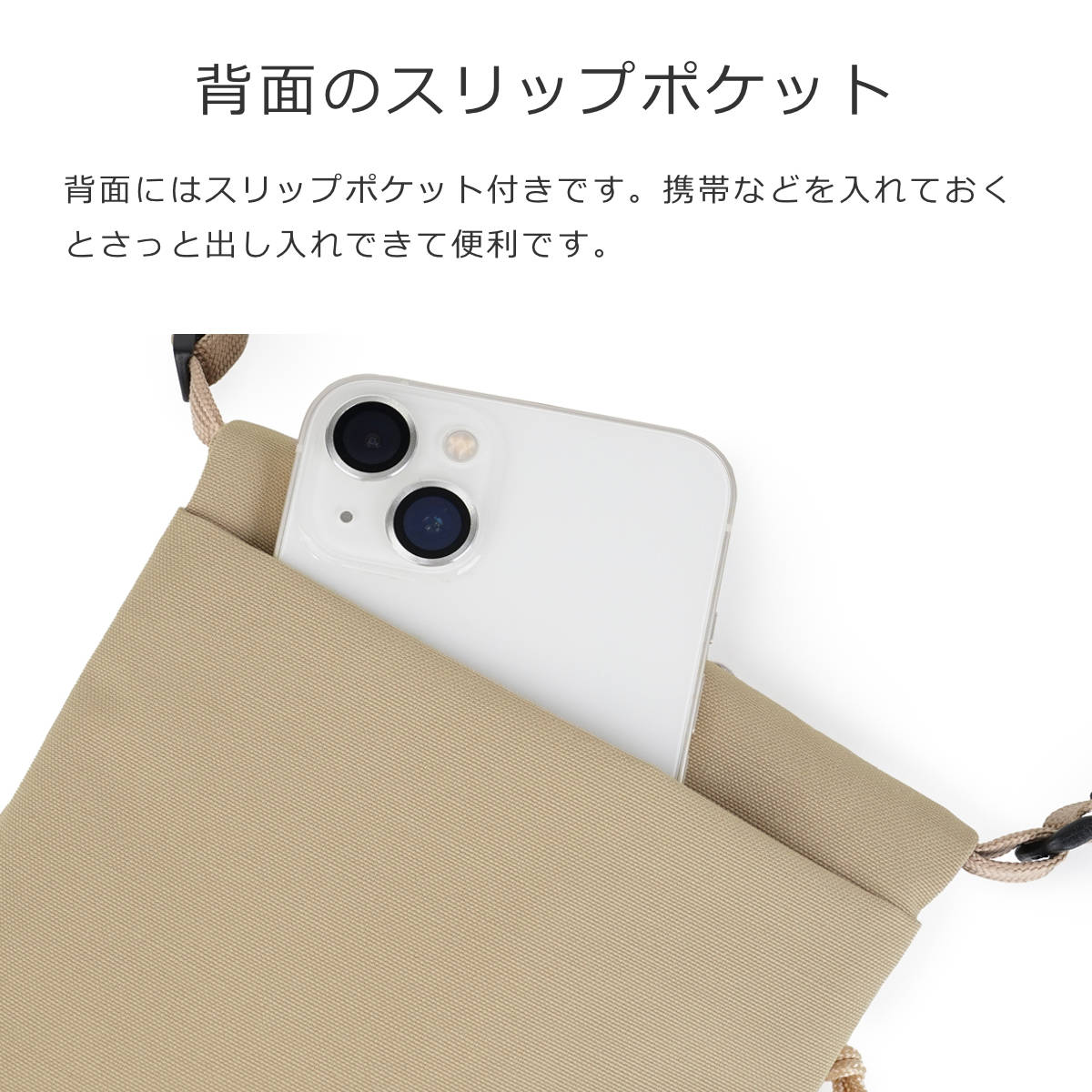 背面にはスリップポケット付きです。携帯などを入れておくとさっと出し入れできて便利です。