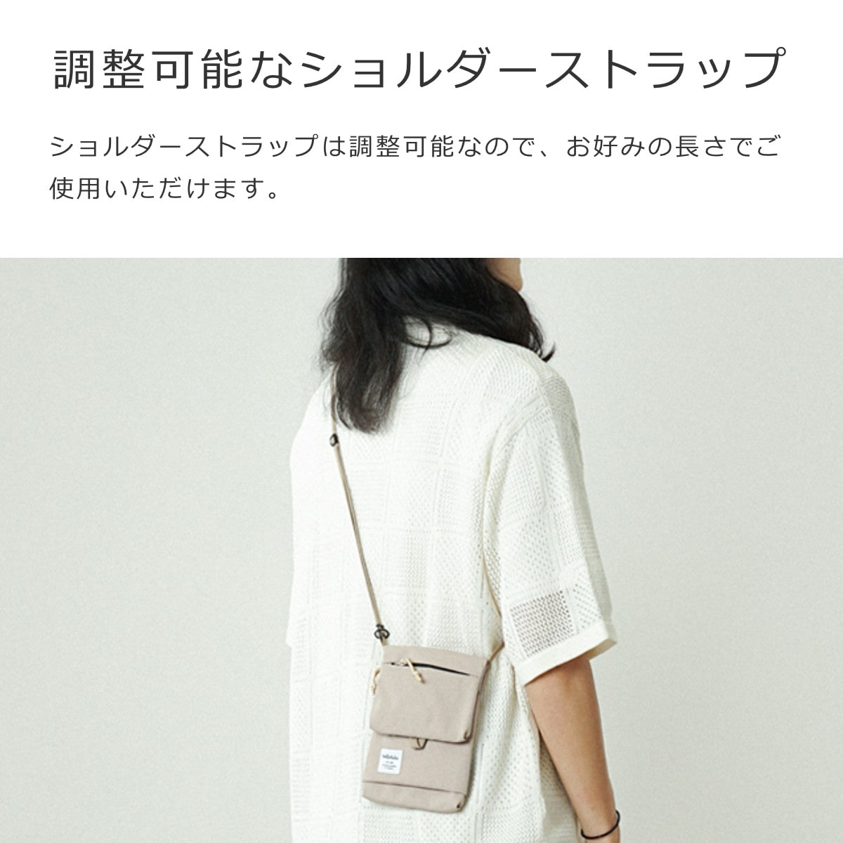 ショルダーストラップは調整可能なので、お好みの長さでご使用いただけます。