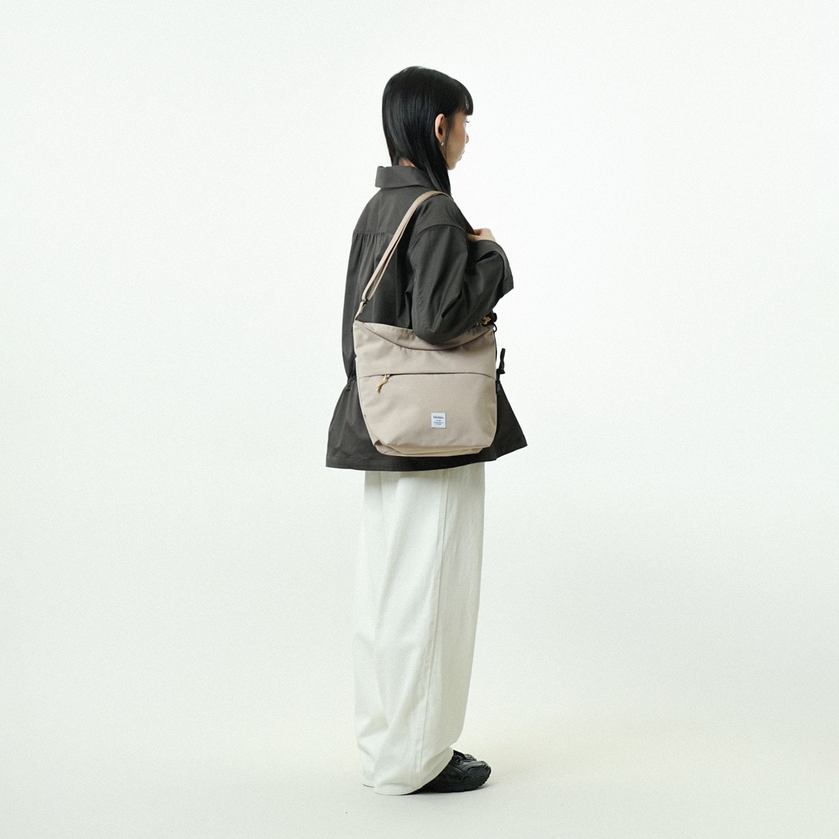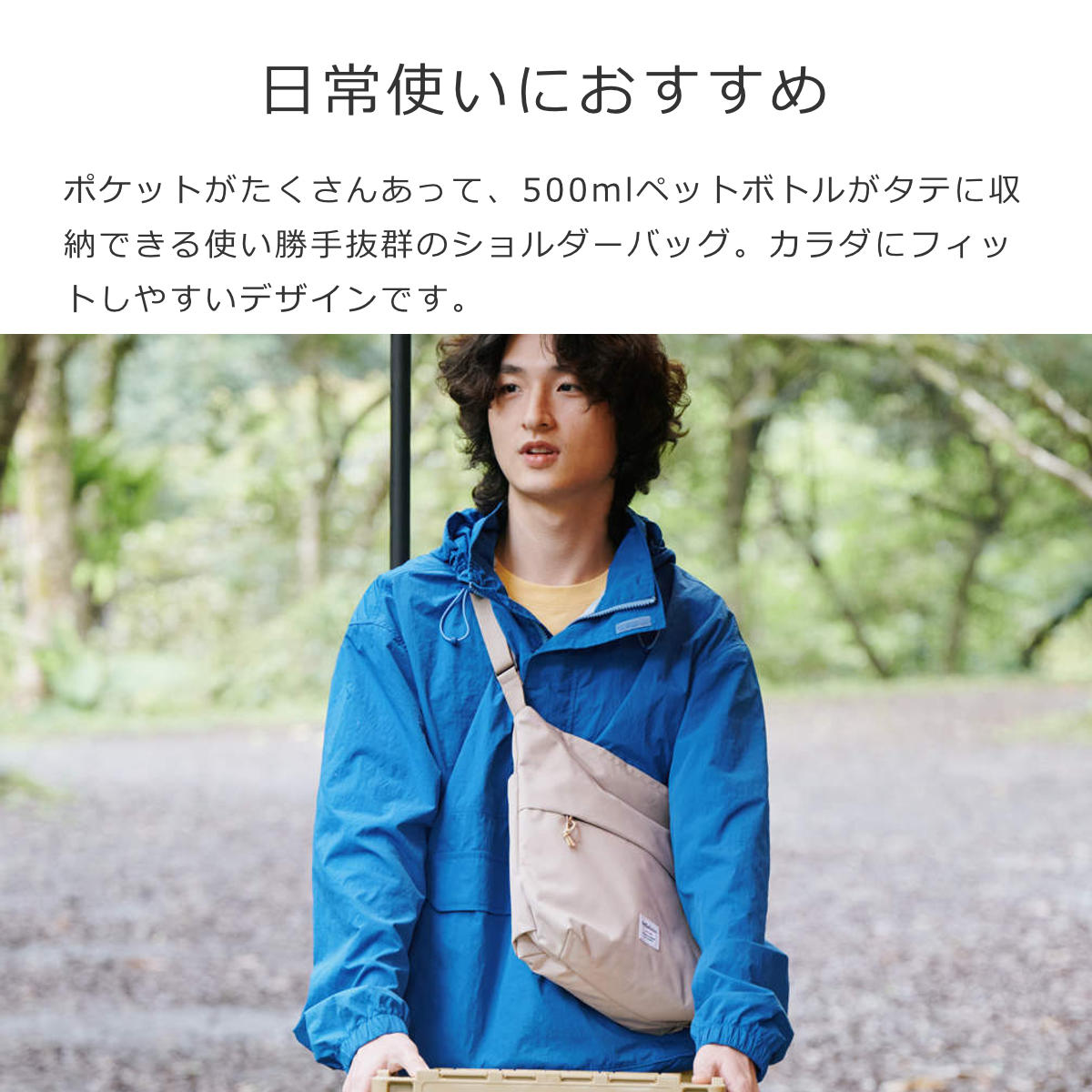 内にも外にもポケットがたくさんあって、500mlペットボトルがタテに収納できる使い勝手抜群のショルダーバッグです。カラダにフィットしやすいデザインです。