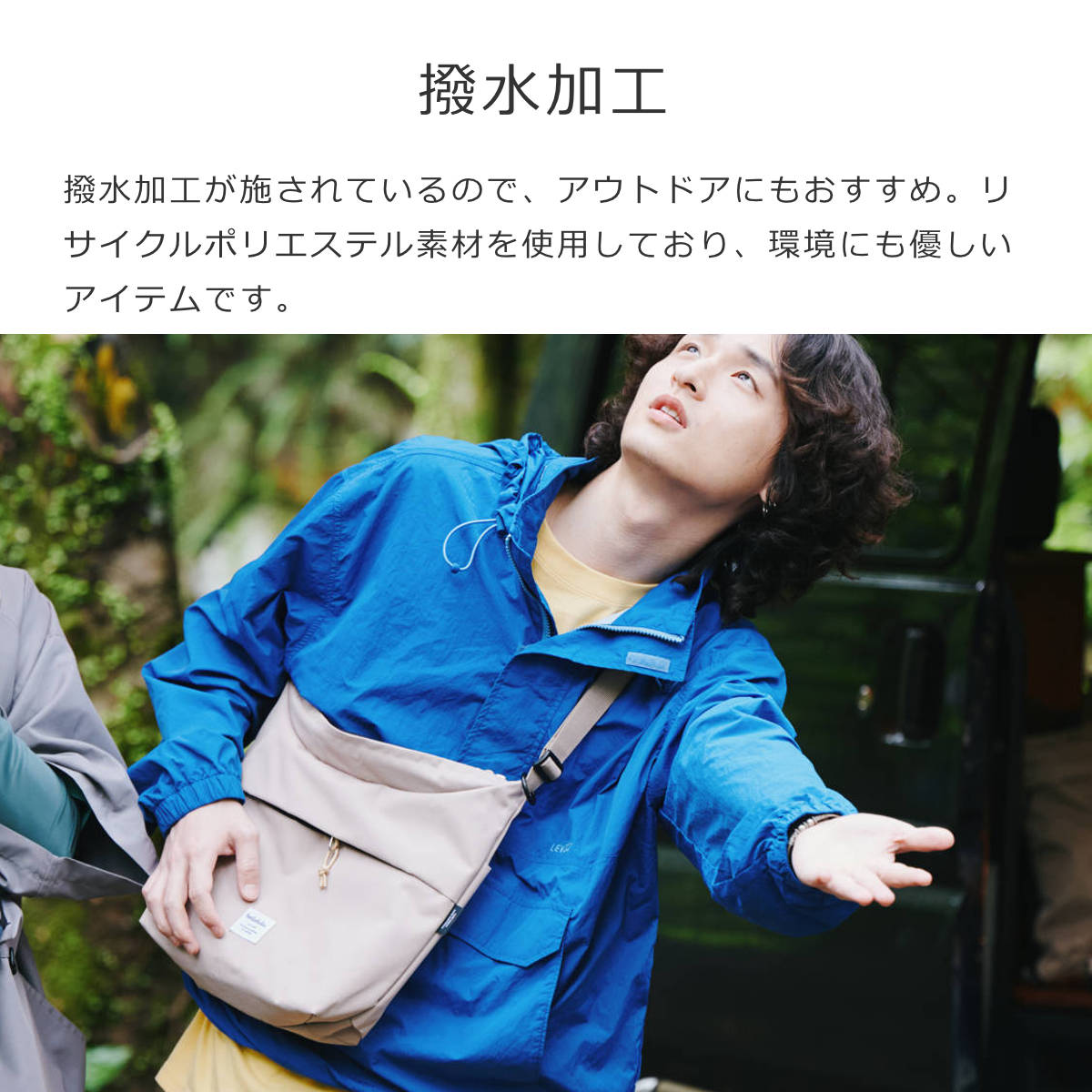 リサイクルしたポリエステル素材を使用しており、軽量で使いやすいだけでなく環境にも優しいアイテムです。撥水加工が施されているので、アウトドアにもおすすめです。