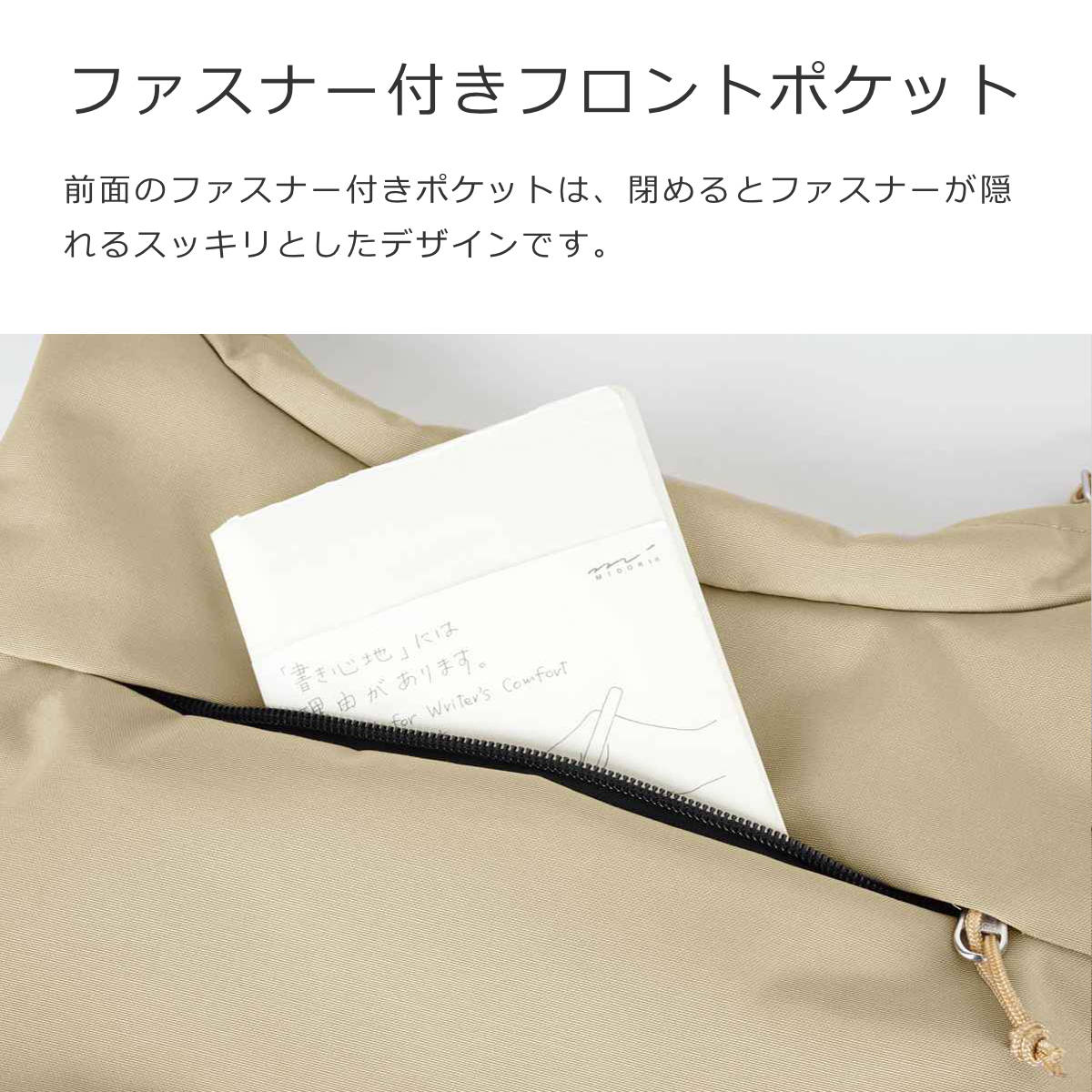 前面のファスナー付きポケットは、閉めるとファスナーが隠れるスッキリとしたデザインです。メイン収納は開閉しやすいダブルファスナー式です。