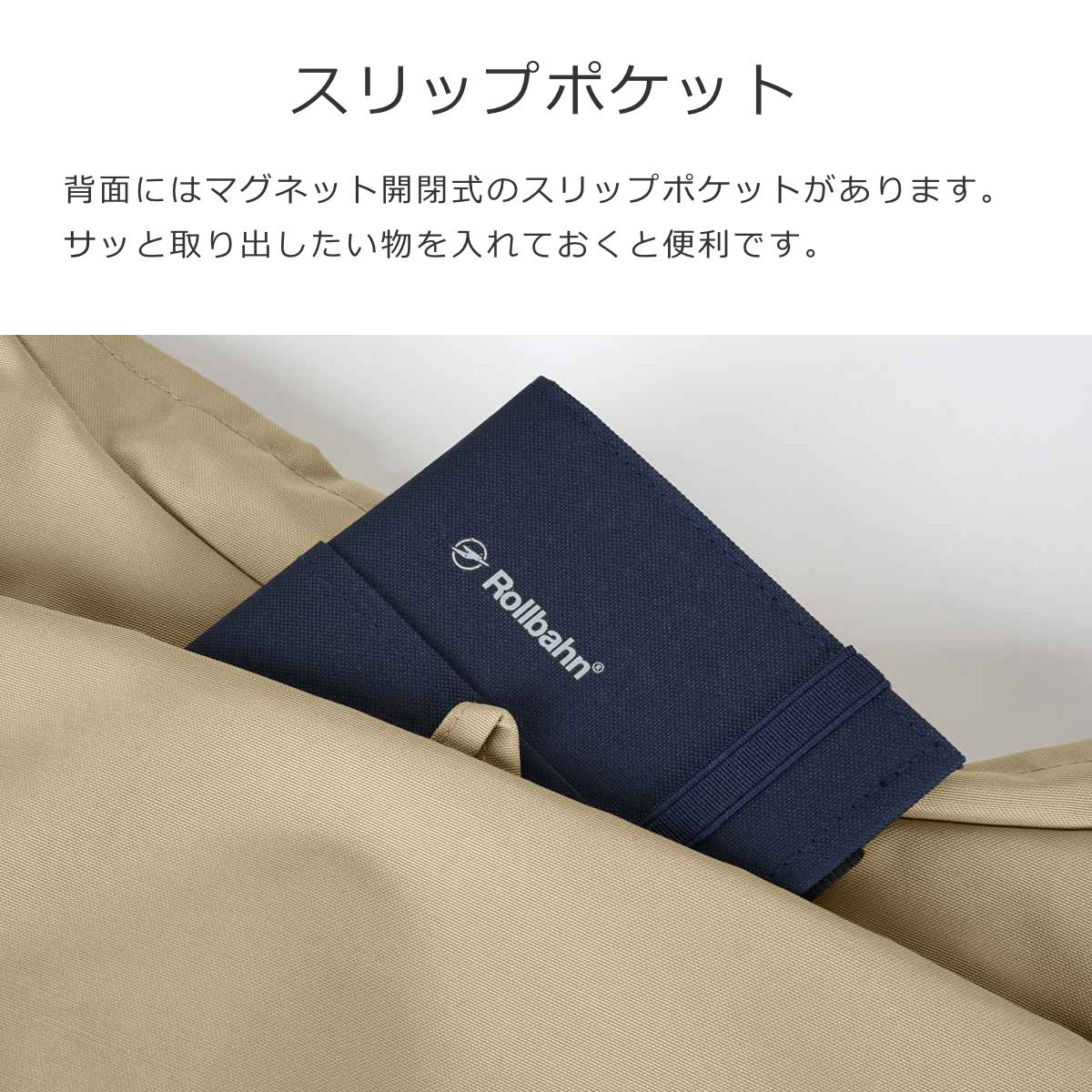 背面にはマグネット開閉式のスリップポケットがあります。サッと取り出したい物を入れておくと便利です。