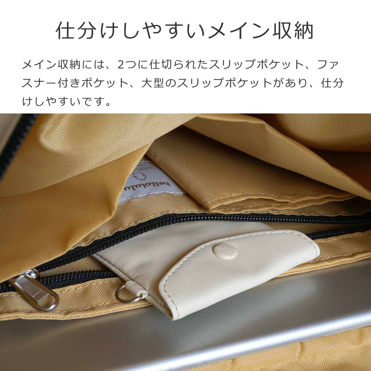 内側には、2つに仕切られたスリップポケット、ファスナー付きポケット、大型のスリップポケットがあります。ポケットが豊富で仕分けしやすいです。