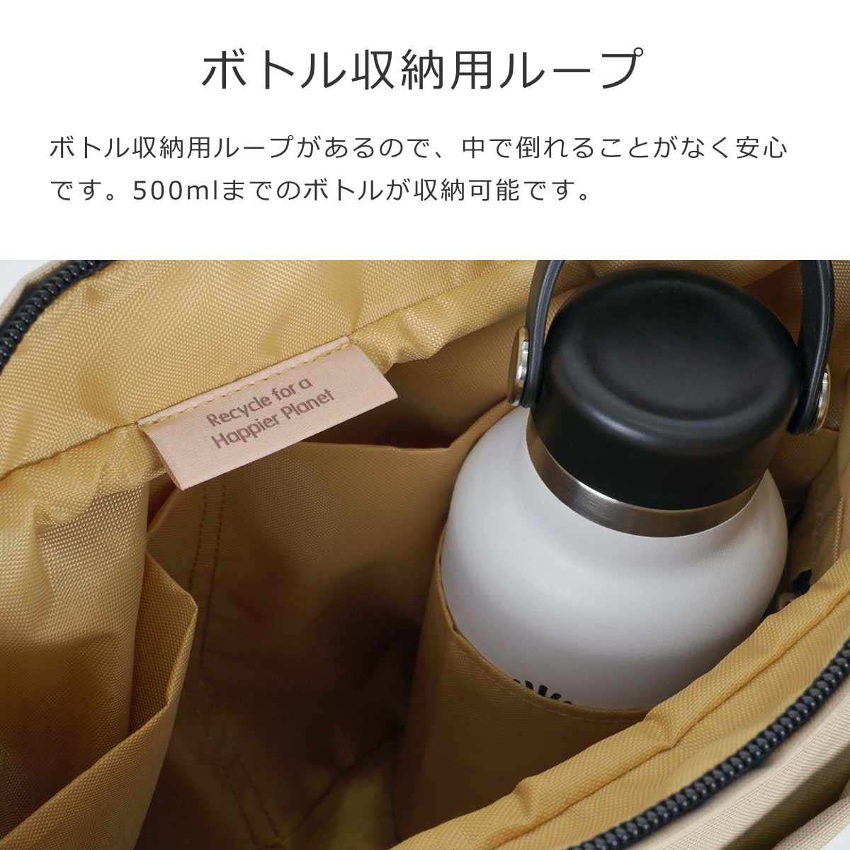 ボトル収納用ループがあるので、中で倒れることがなく安心です。500mlまでのボトルが収納可能です。