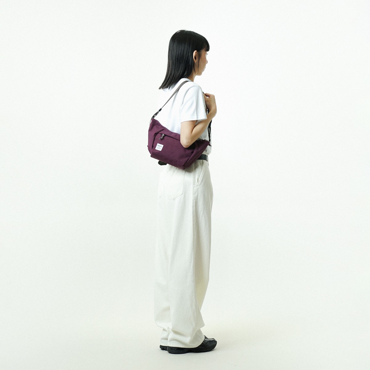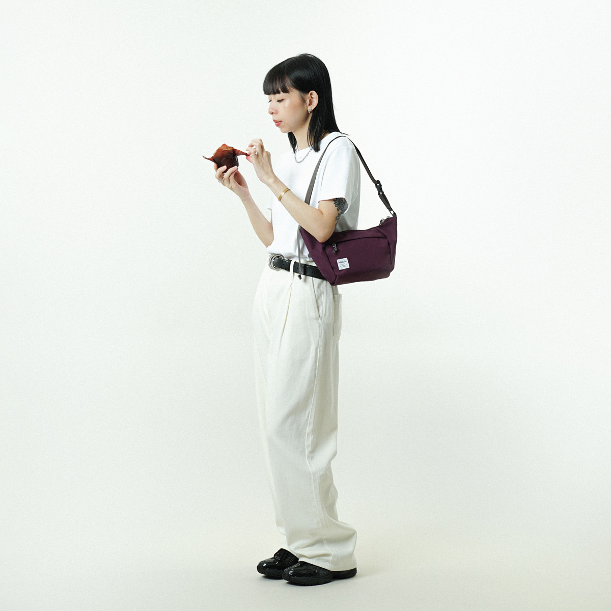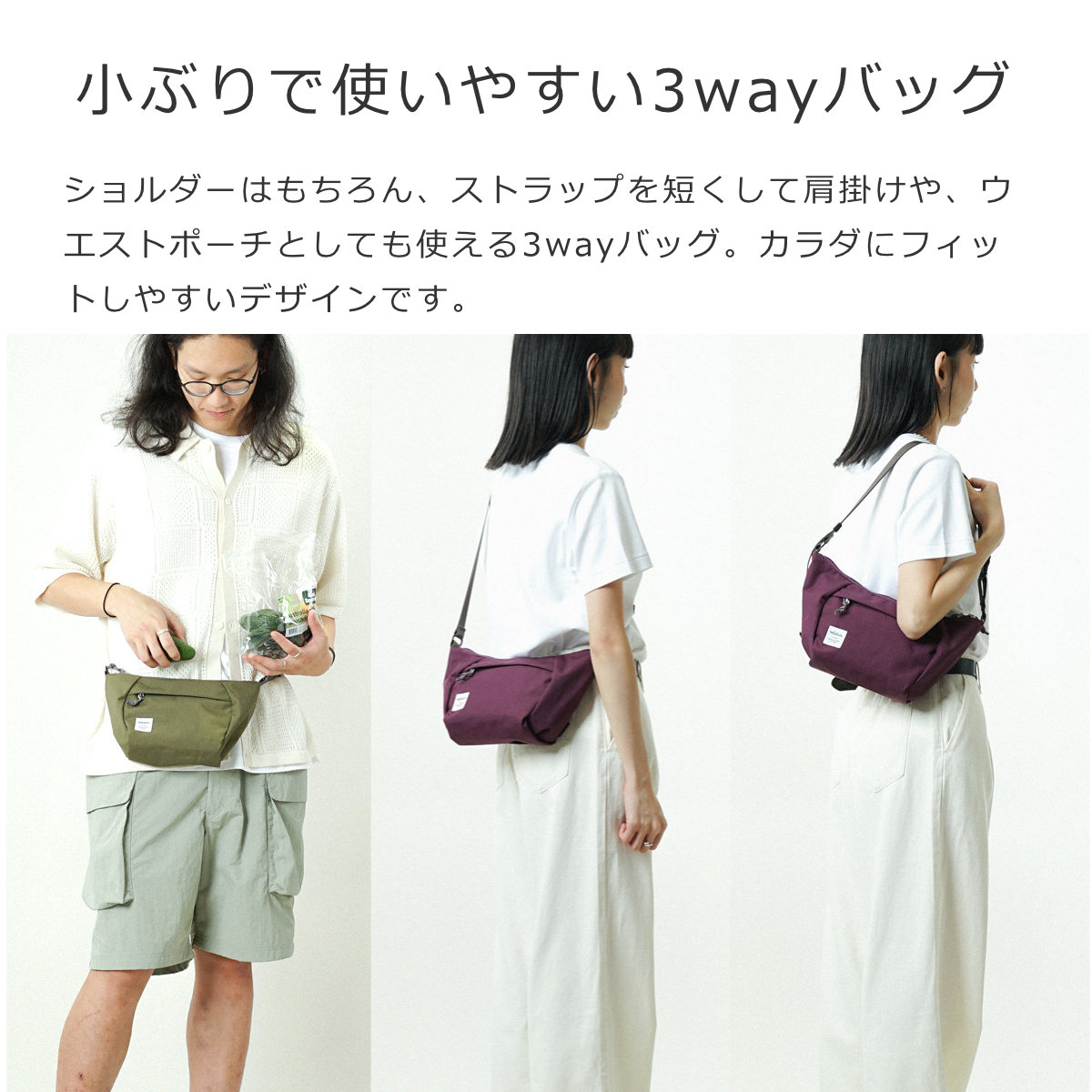 ショルダーはもちろん、ストラップを短くして肩掛けにしたり、ウエストポーチとしても使える3wayバッグです。小ぶりで使いやすく、カラダにフィットしやすいデザインです。