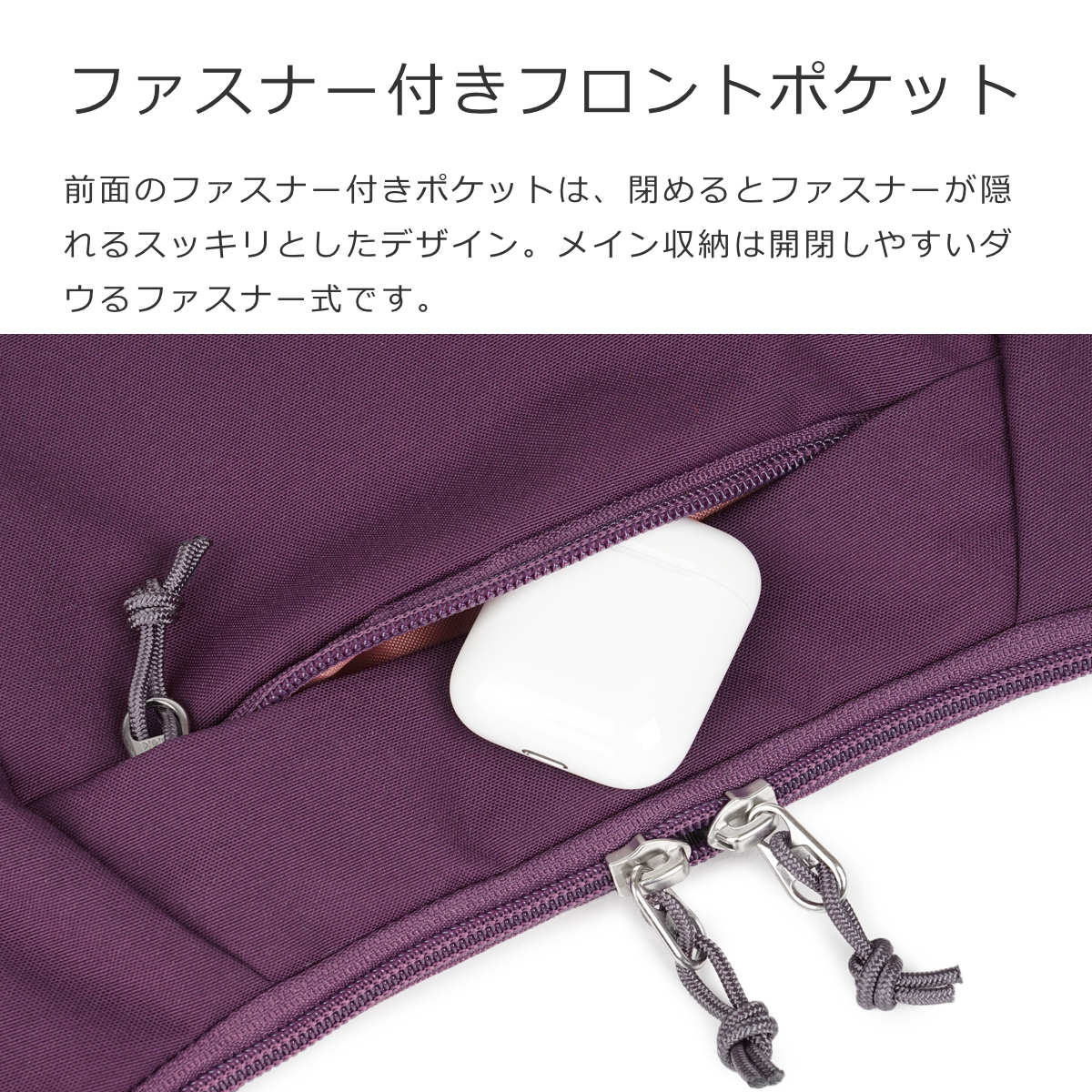 前面のファスナー付きポケットは、閉めるとファスナーが隠れるスッキリとしたデザインです。メイン収納は開閉しやすいダブルファスナー式です。