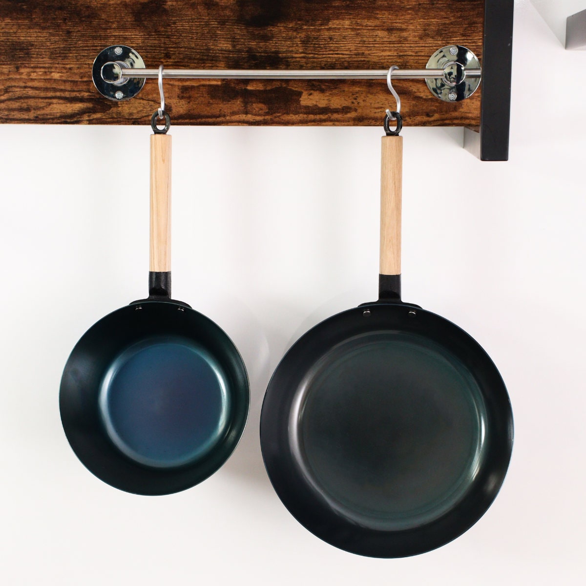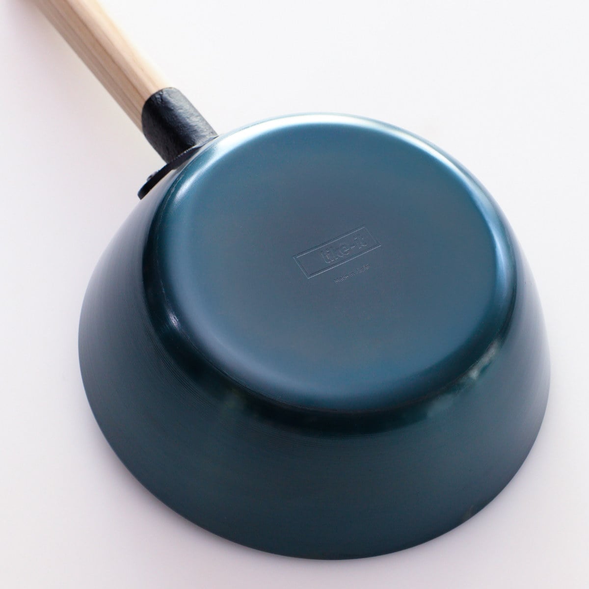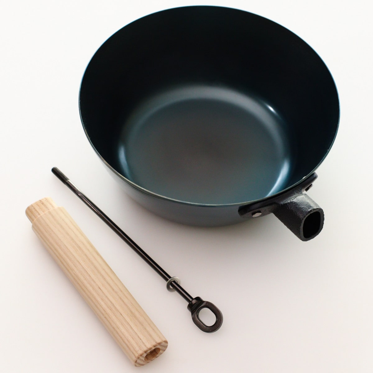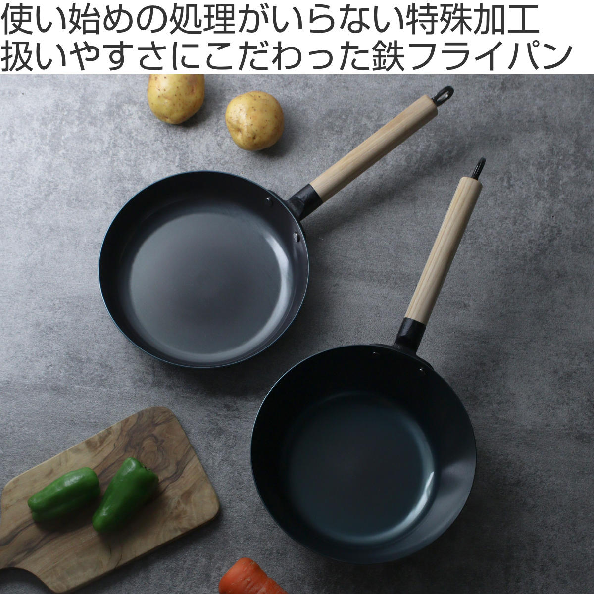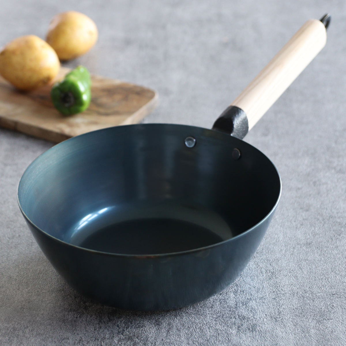 ハードテンパー加工が施された鉄フライパンです。本体には赤サビが発生しにくい黒皮鉄を使い、さらに仕上げで700度近くなるまで焼き入れ加工を施しています。この加工により、使い始めでも油がなじみやすくなり、使い始めの「空焼き・油ならし」が不要になりました。