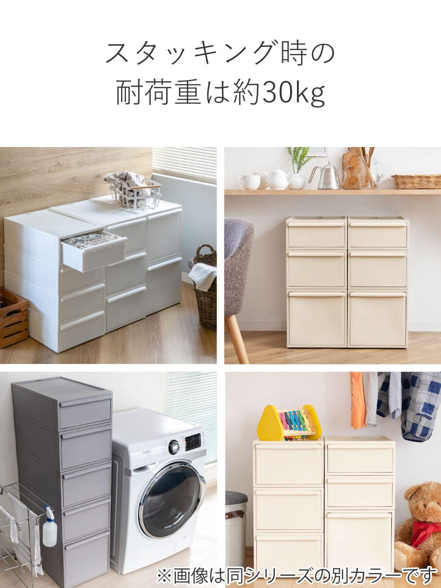 スタッキング時の耐荷重は約30kgです。洗剤や食品など日用品のストック収納にぴったりです。クローゼット、キッチン、洗面所、リビングなど様々な場所の収納に役立ちます。丈夫なポリプロピレン製で、汚れても水拭きできて衛生的です。スタッキングすると、1段につき高さが約6mm縮みます。