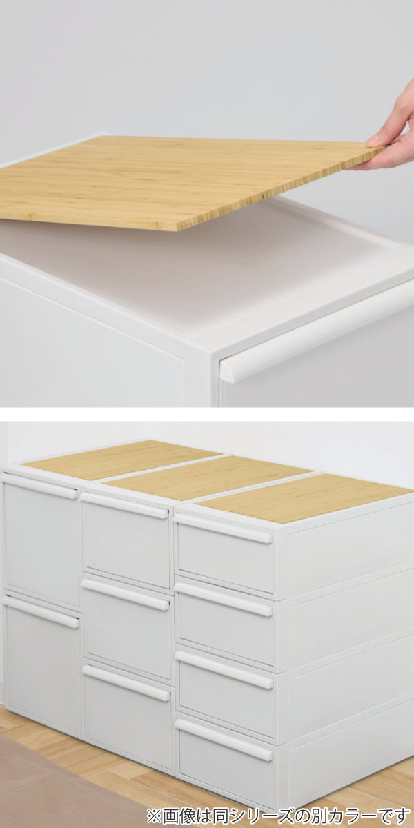 別売りの竹製天板をクローゼットシステム上の凹部に設置できます。天板を取り付けることでナチュラルな家具との相性も良くなります。