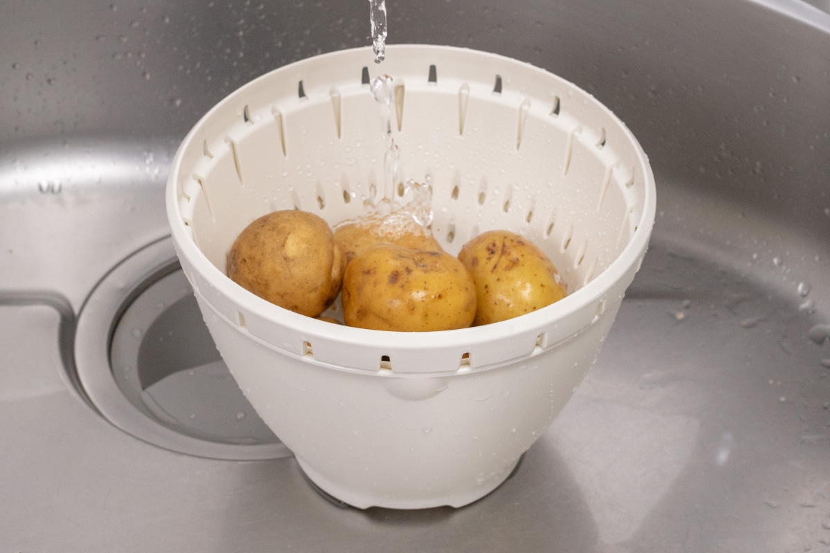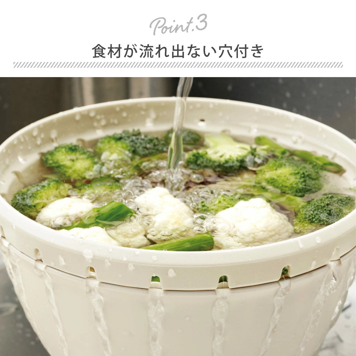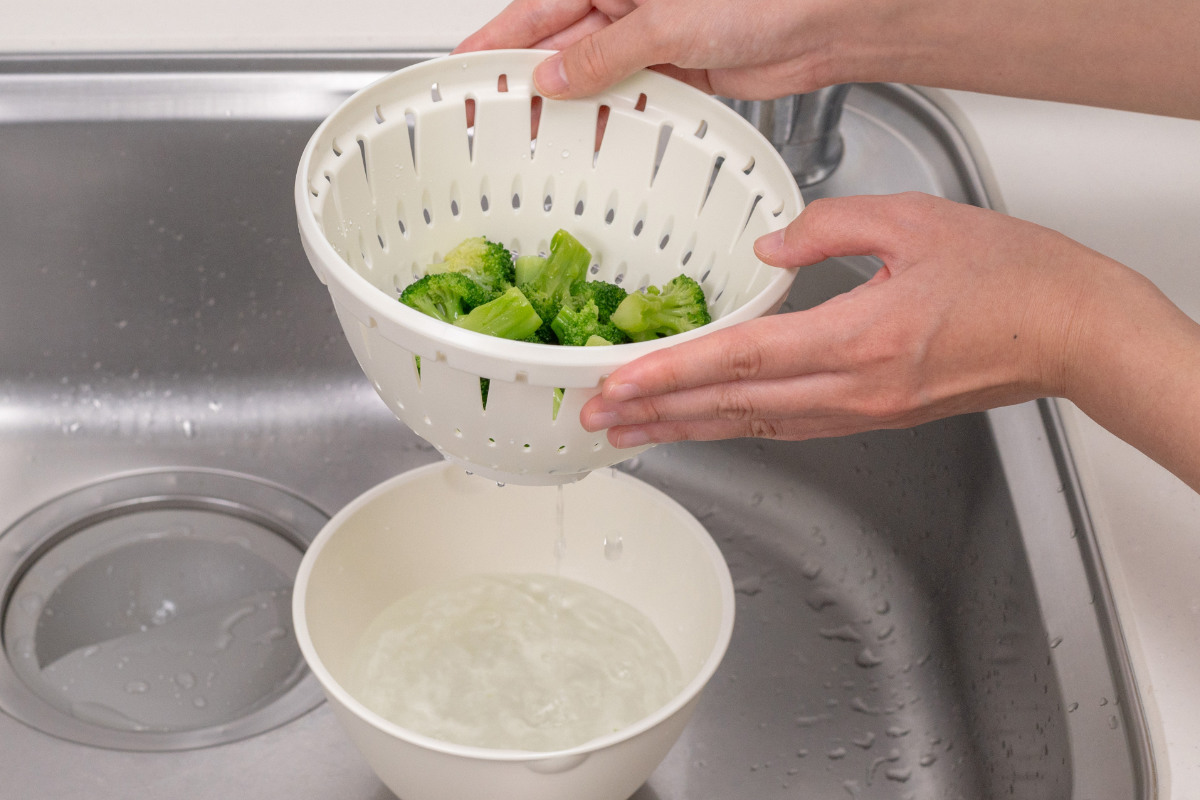 コランダーに空いた穴から水が流れるので、ボウルを重ねたまま水を注いでも食材があふれません。流水解凍時にも活躍します。