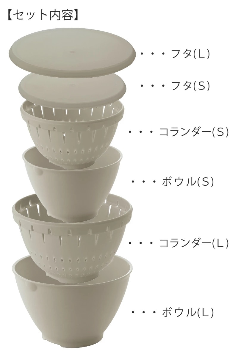 | 内容量 | 6点セット (Sサイズ:ボール、コランダー、フタ/Lサイズ:ボール、コランダー、フタ 各1個) |