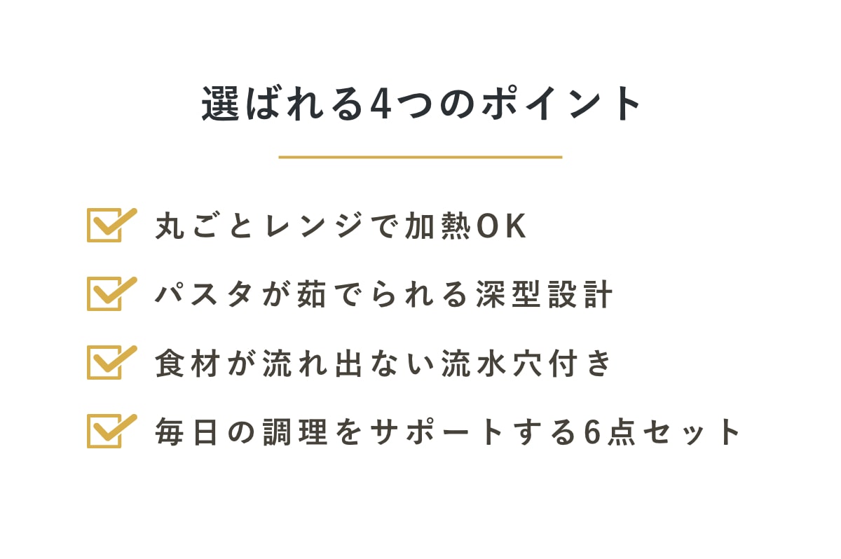 Lサイズには半分に折ったパスタが入る深型設計です。適量の水を入れ、レンジでチンすれば専用の容器を使わずにパスタが茹で上がります。コランダーを持ち上げると湯切りが安全にできます。