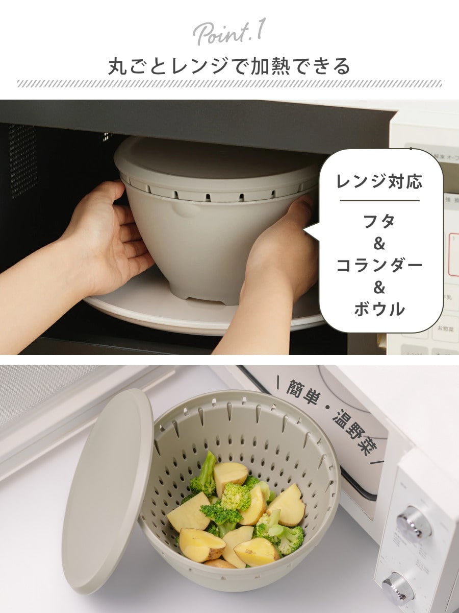 ボウル・コランダー・フタ、まるごと電子レンジで加熱できます。ボールにセットしたコランダーの中に食材を入れ、フタをしてレンジで加熱。コランダーの穴から余分な水分や油が落ち、温野菜も美味しくでき上がります。