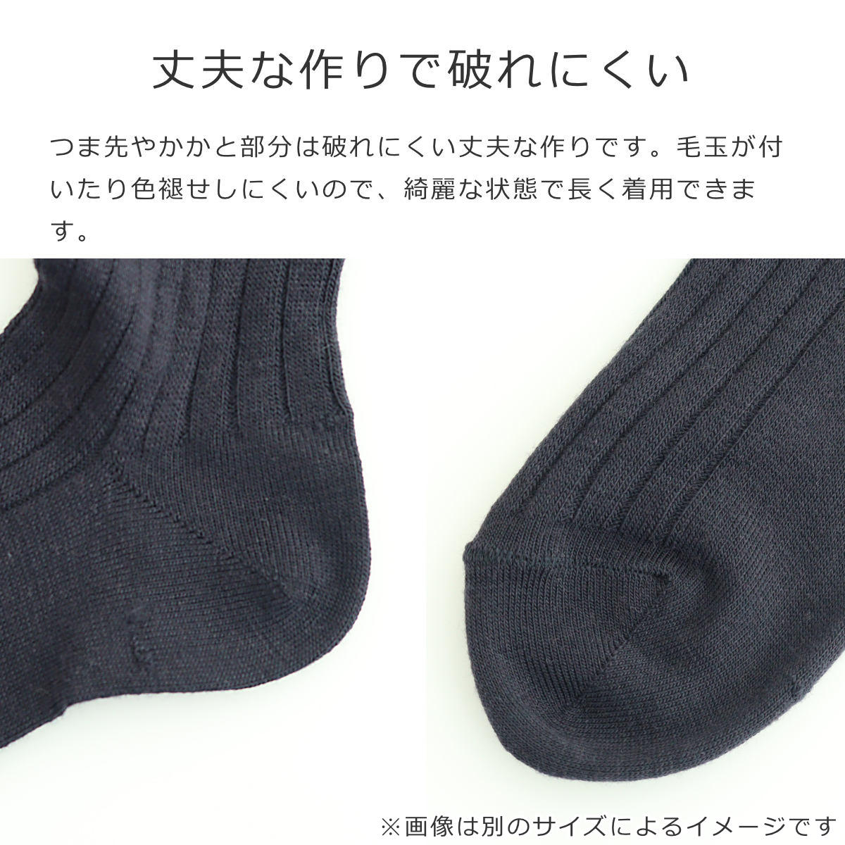 つま先やかかと部分は破れにくい丈夫な作りです。毛玉が付いたり色褪せしにくいので、綺麗な状態で長く着用できます。
