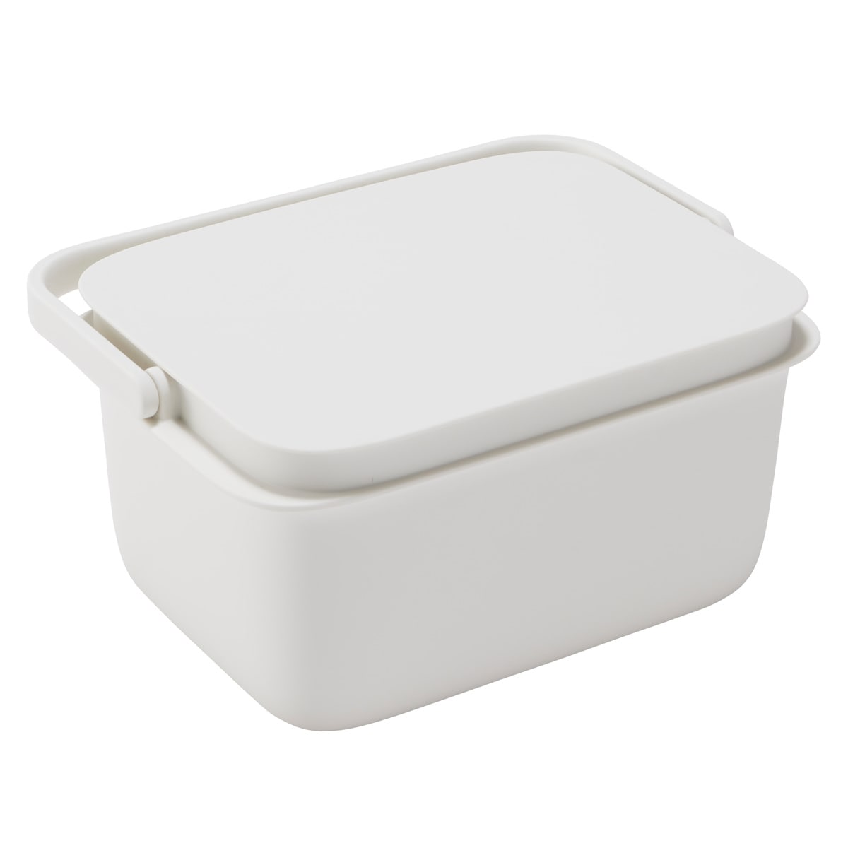 四角いバケツは角にフィットし、きれいに収まります。重ね置きもでき、お部屋や収納の角にフィットしてすっきり収納できます。優しいホワイトが空間に溶け込み、出しっぱなしでも気にならないデザインです。