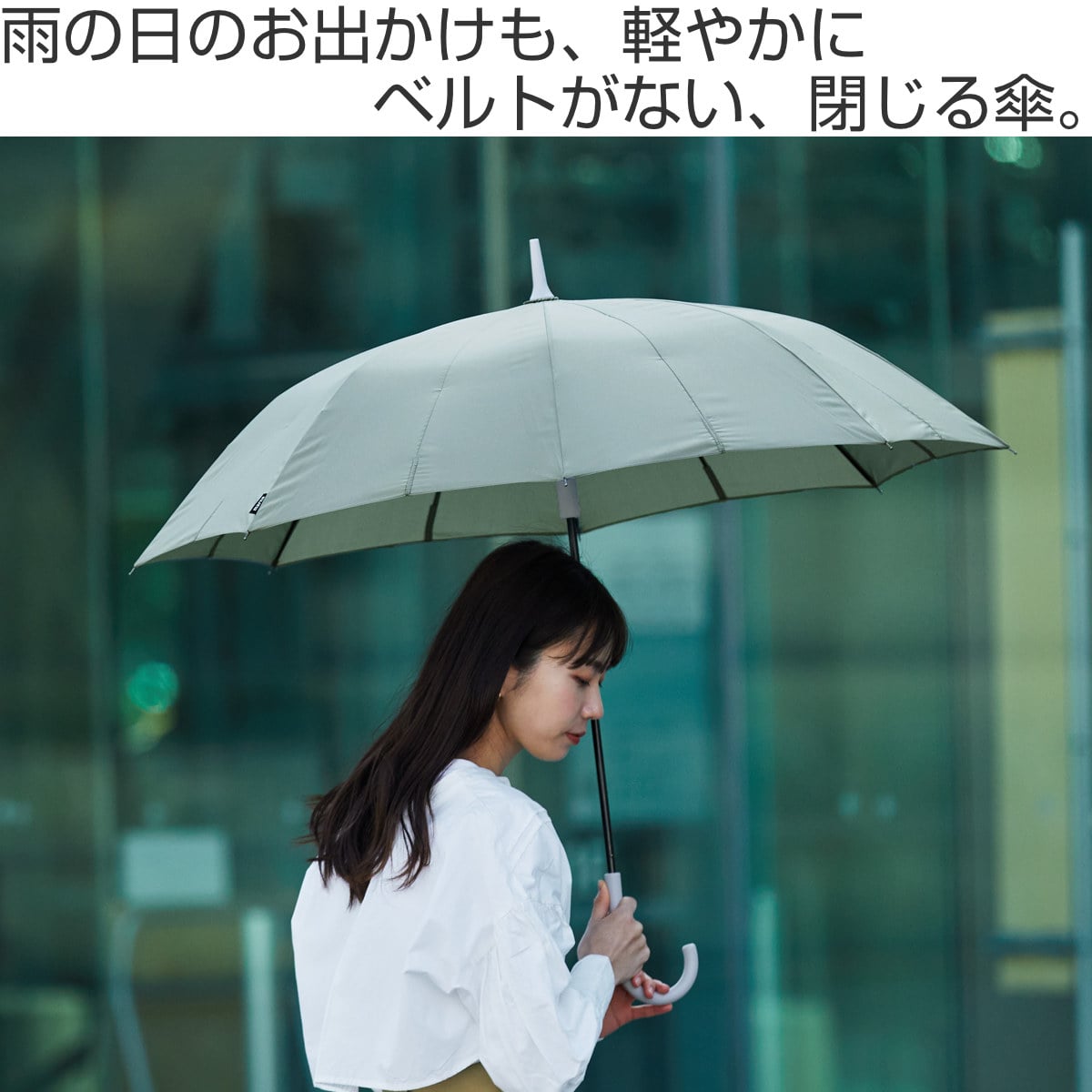 閉じる動きに連動して骨が回転し、軸を中心に生地がくるくると巻き込まれます。最後に手で生地をまとめたり、ベルトで留める必要がなく、手を濡らさずに素早く傘をたたむことができます。
