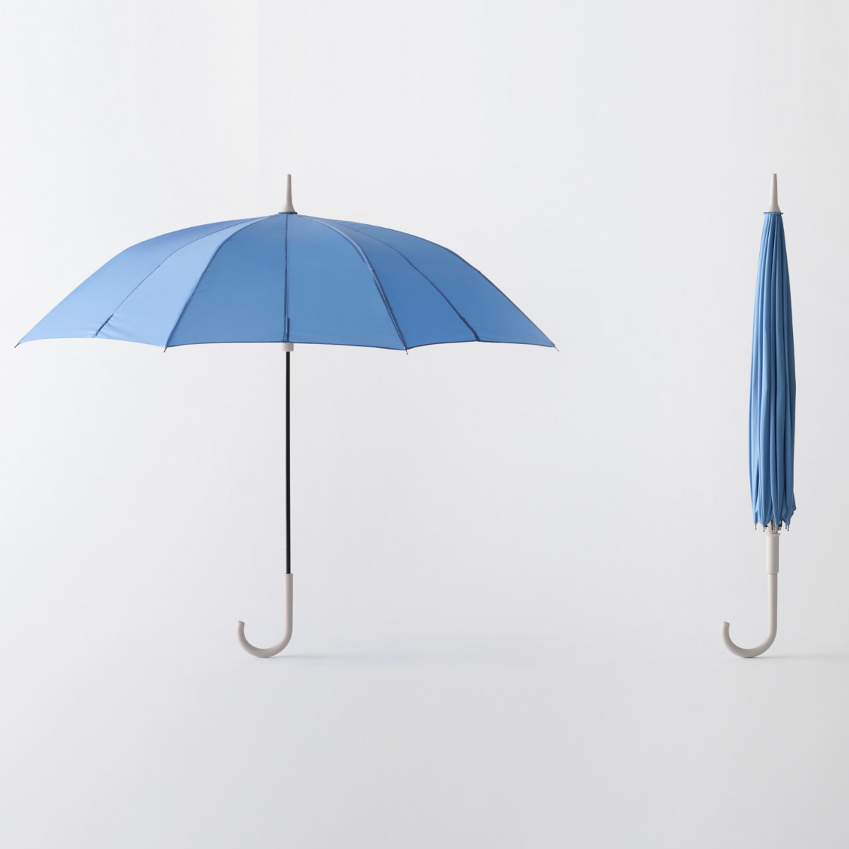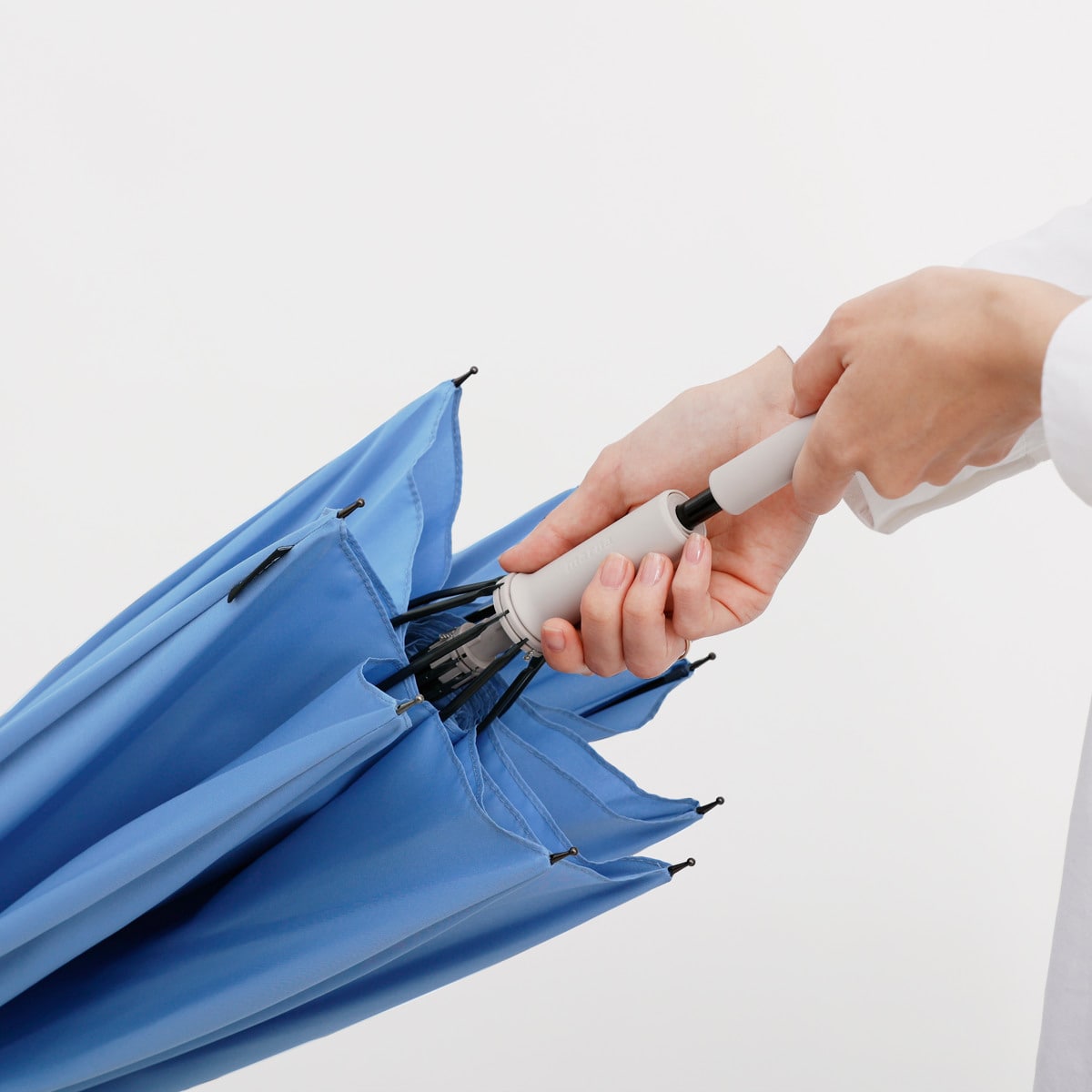 閉じる動きに連動して骨が回転し、軸を中心に生地がくるくると巻き込まれます。最後に手で生地をまとめたり、ベルトで留める必要がなく、手を濡らさずに素早く傘をたたむことができます。