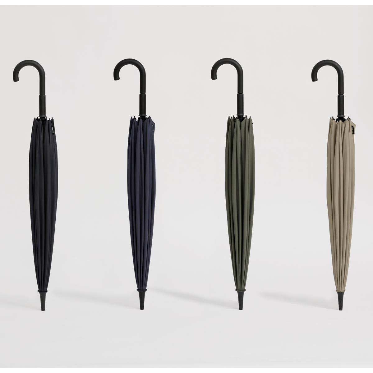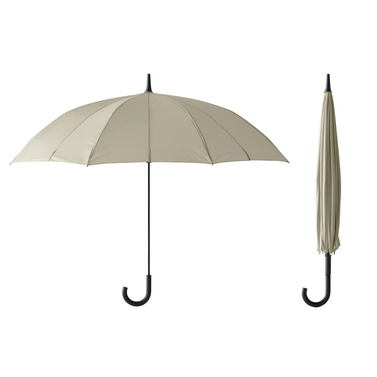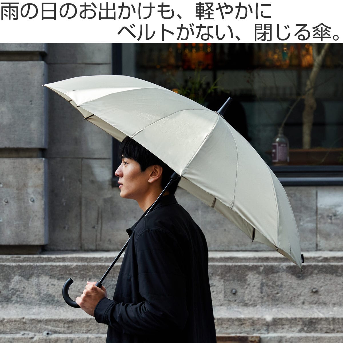閉じる動きに連動して骨が回転し、軸を中心に生地がくるくると巻き込まれます。最後に手で生地をまとめたり、ベルトで留める必要がなく、手を濡らさずに素早く傘をたたむことができます。