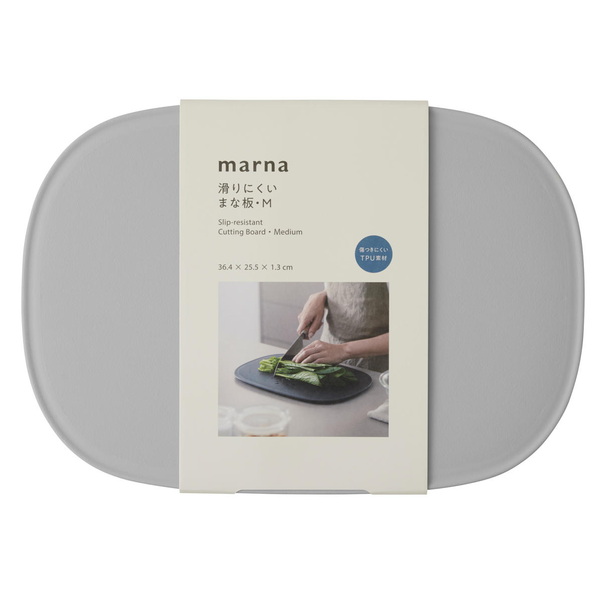裏面にある四隅のグリップと適度な重さで滑りにくく、安定して切れるまな板です。葉物野菜からお肉、魚まで置ける日常使いにちょうどいいサイズです。
