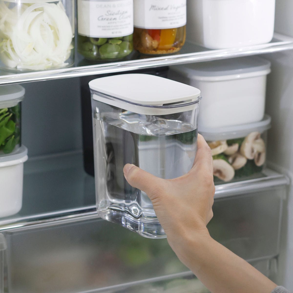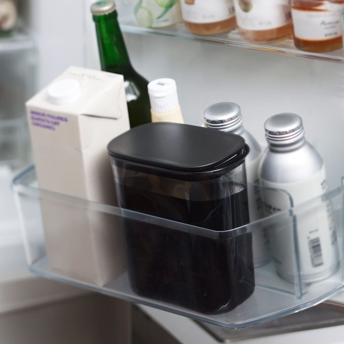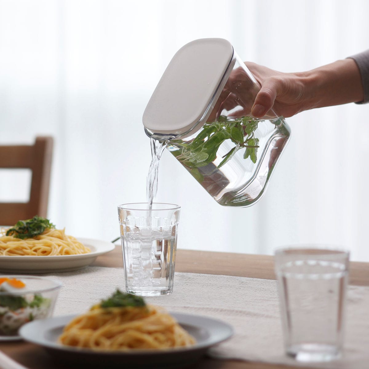 1~2人暮らしに使いやすい容量1Lです。スリム設計の冷水筒は、冷蔵庫のドアポケットにもスッキリと収まります。