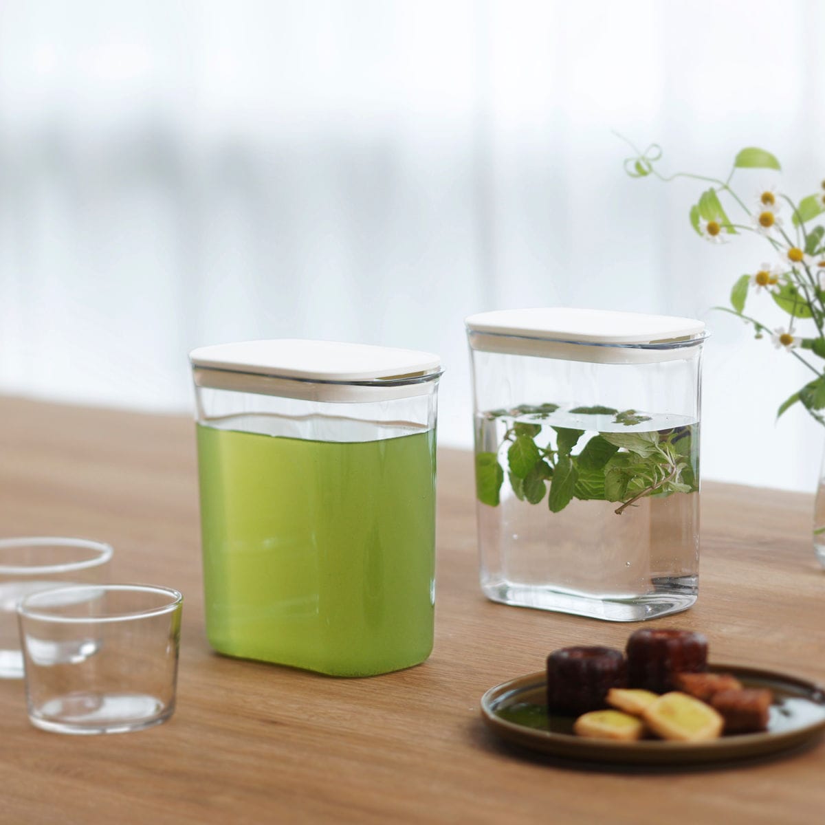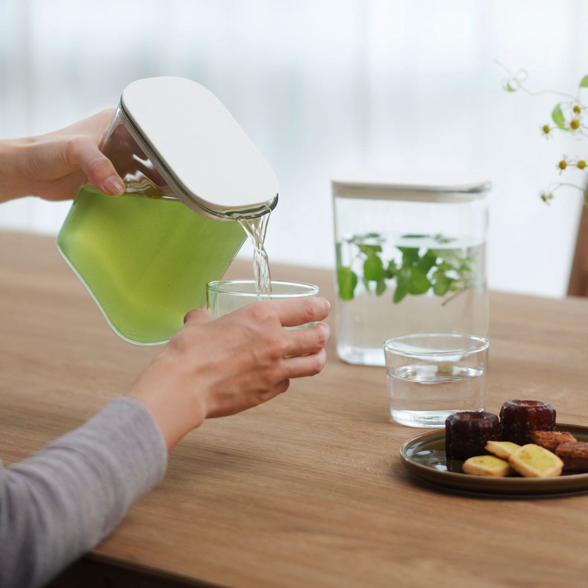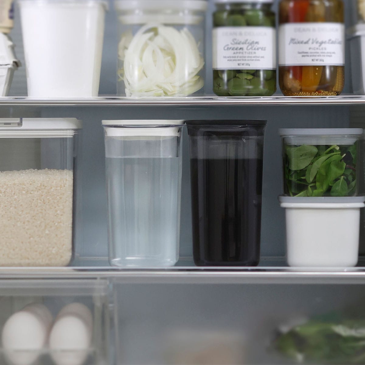 1~2人暮らしに使いやすい容量1Lです。スリム設計の冷水筒は、冷蔵庫のドアポケットにもスッキリと収まります。