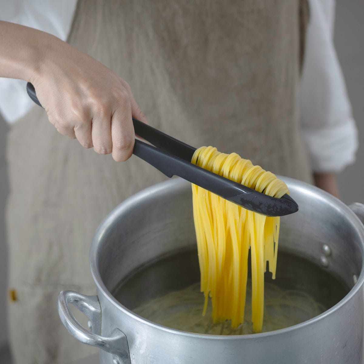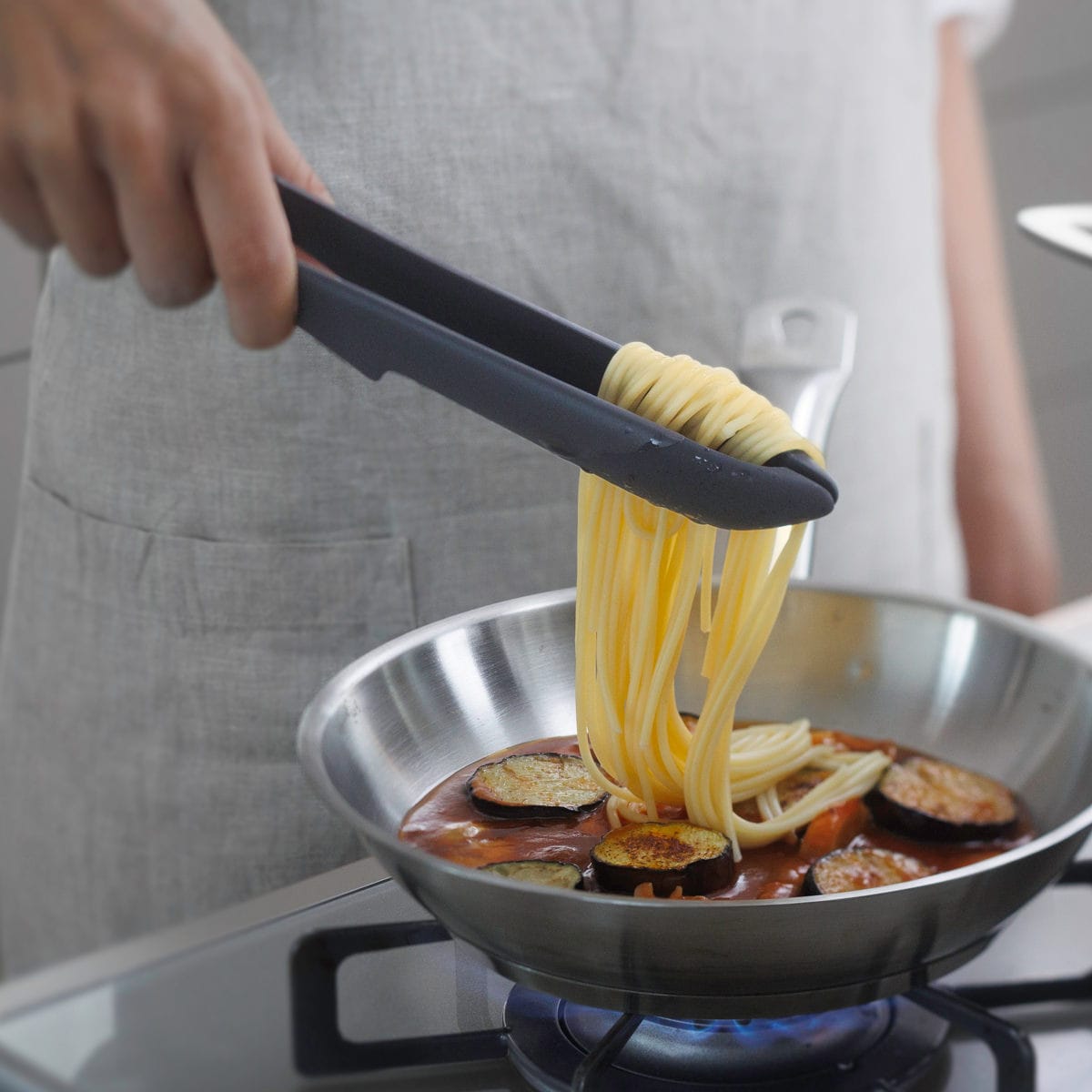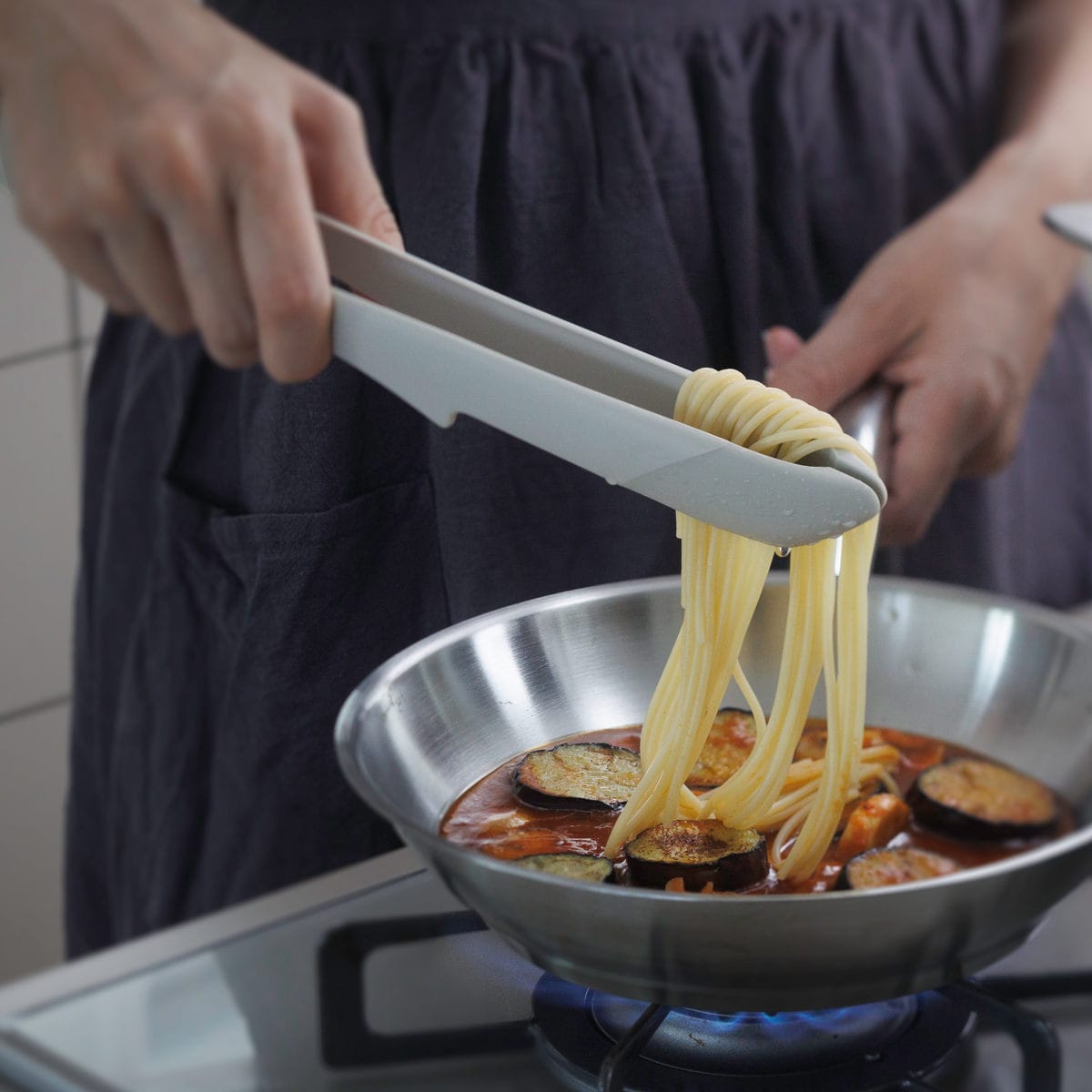 トング先端がぴったり合い、食材をしっかり掴めます。閉じた際にトング内側にスペースができるので、麺類をたっぷり掴んでもちぎれません。