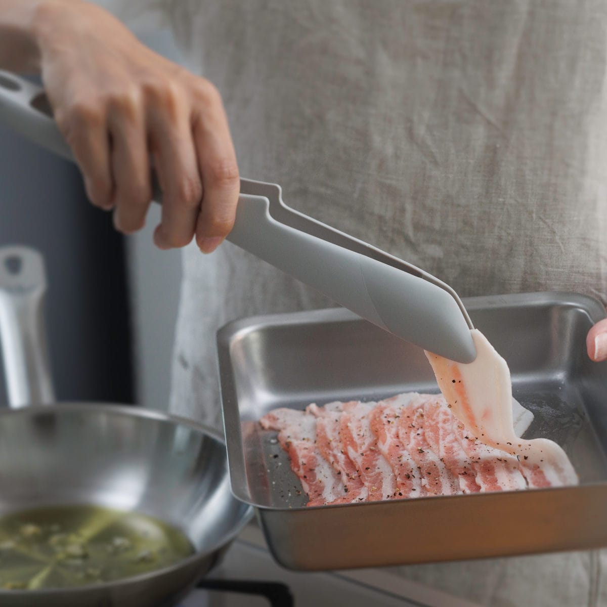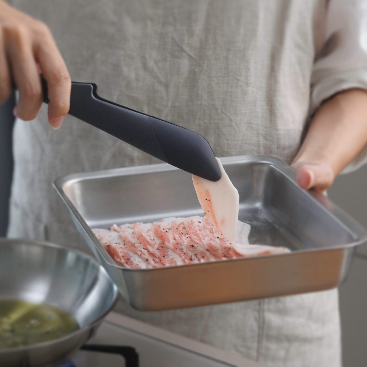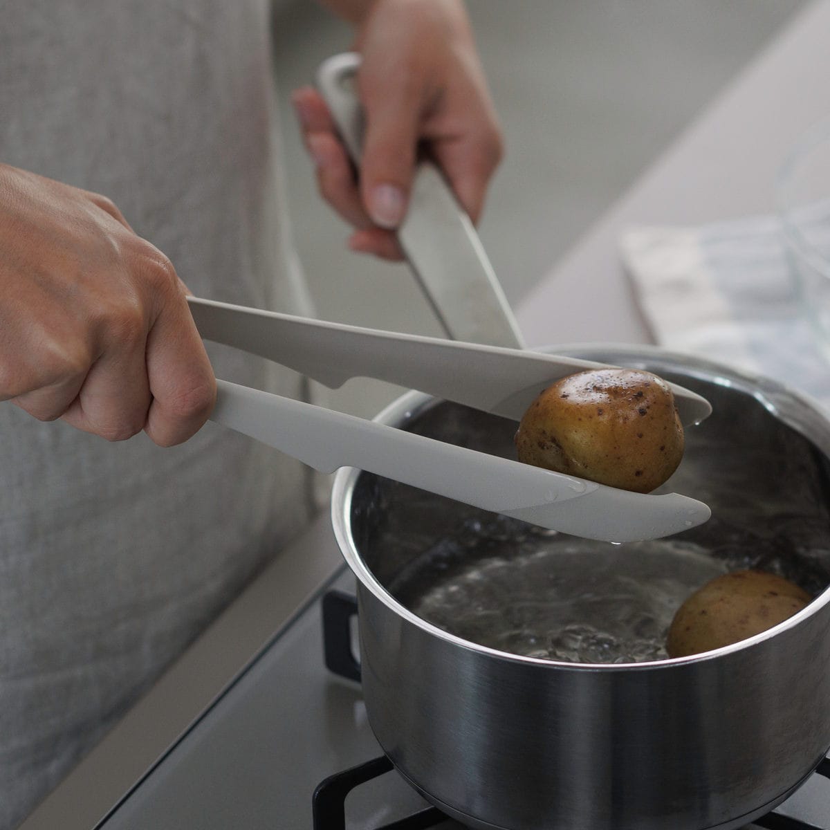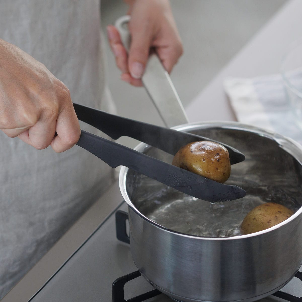 尖った先端で薄切り肉も掴みやすく繊細な作業が可能です。内側がへこんだ形状でジャガイモなどの大きな食材もしっかり掴めます。