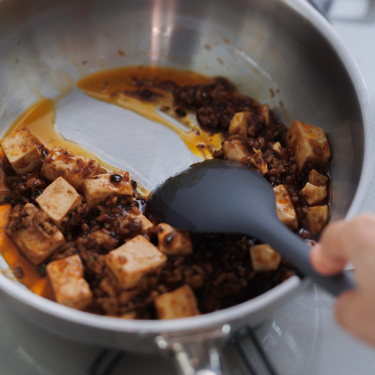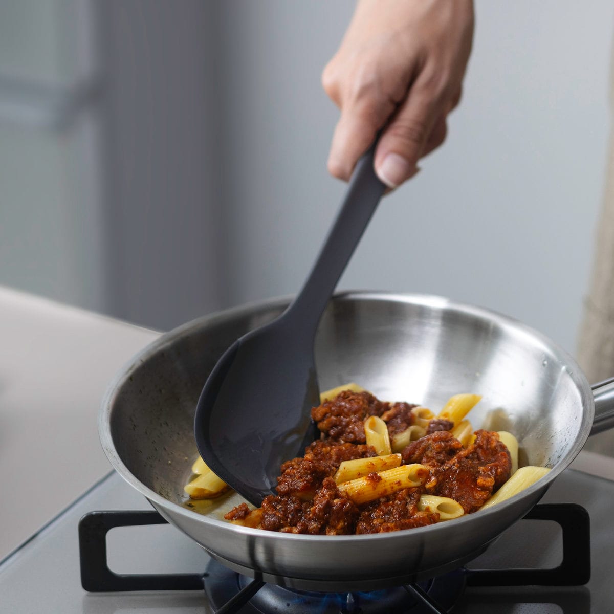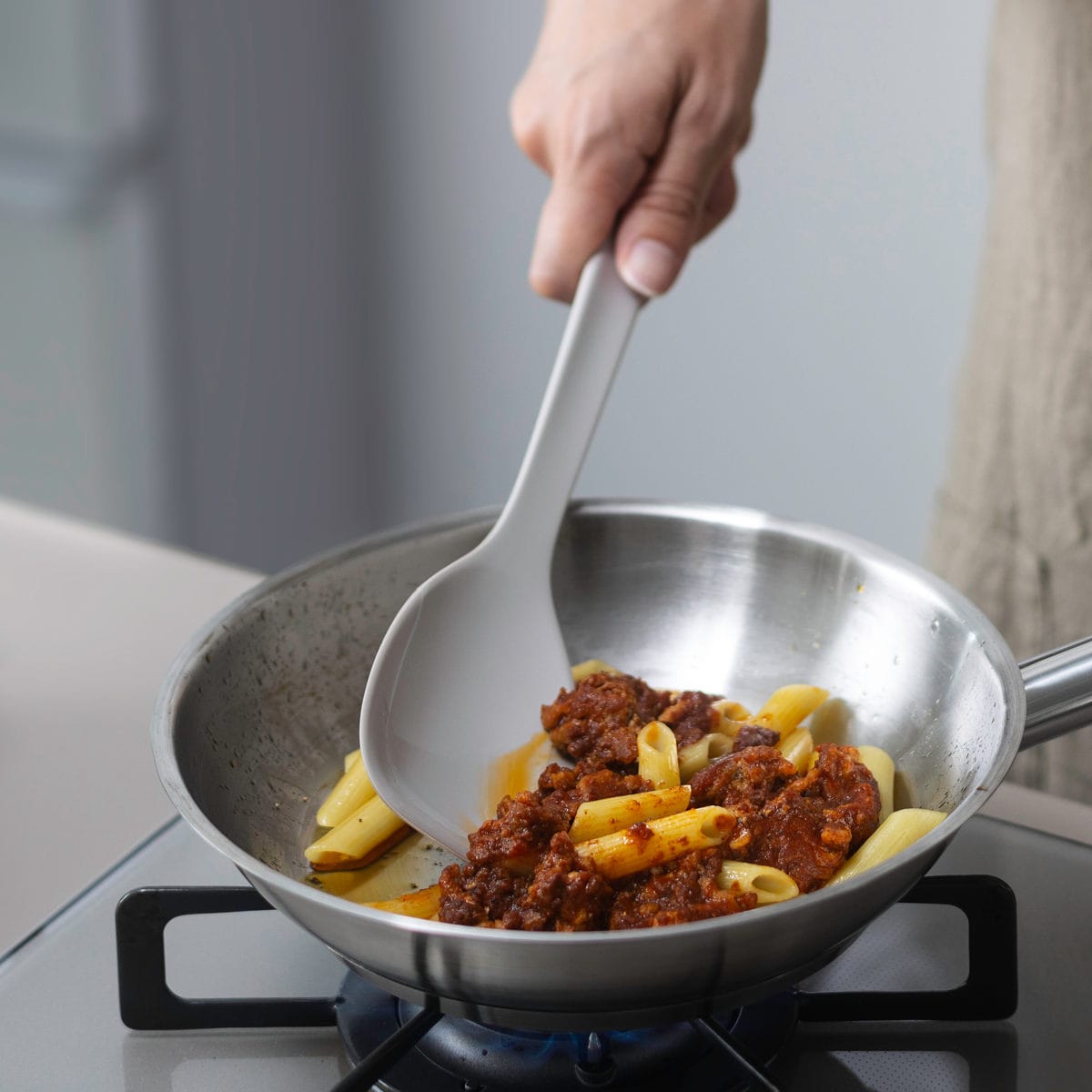 ヘラとスプーンが1つになった小回りのきく万能ツールです。小回りが利きつつ、一度にたくさん炒める時でも扱いやすい長さです。スプーンの先端が鍋肌にフィットして、残さずすくえます。