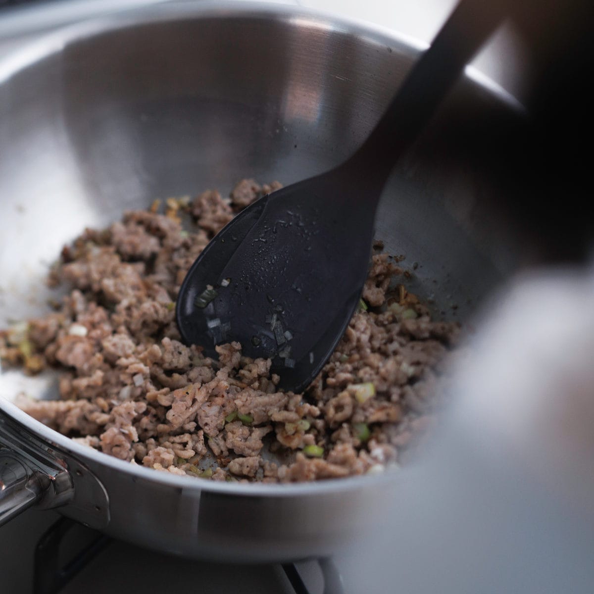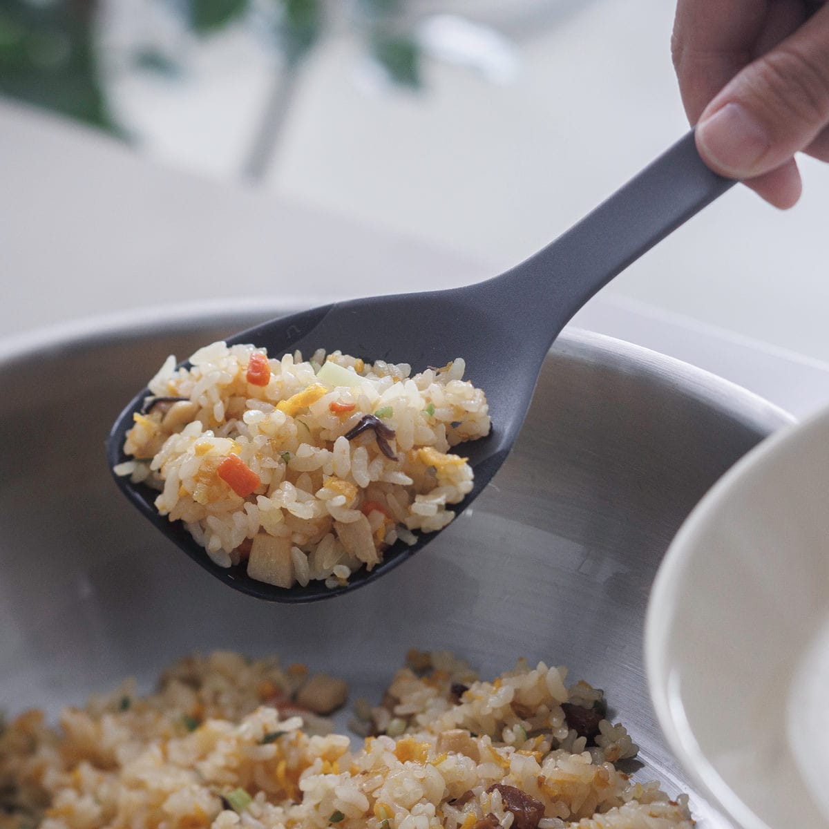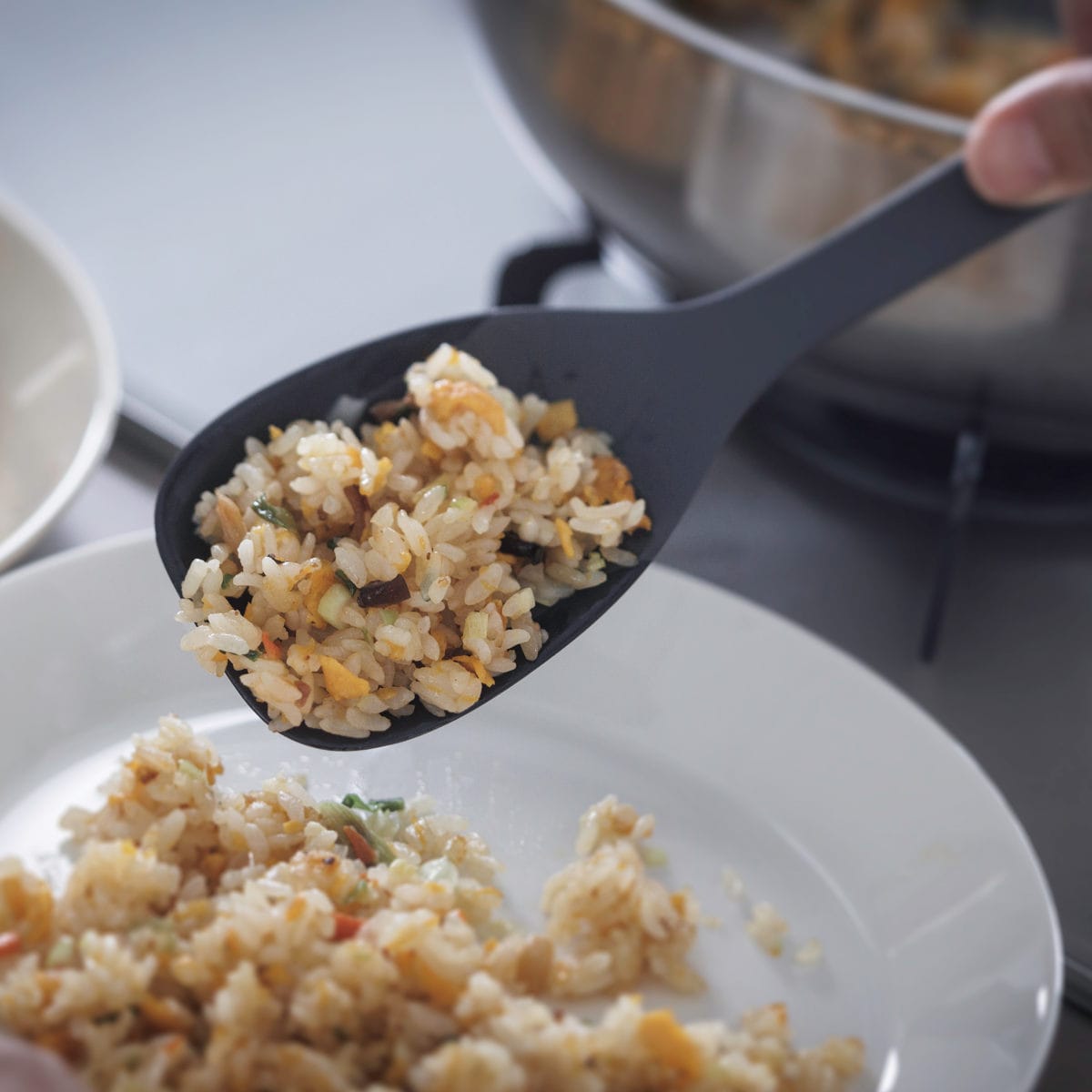 浅めのスプーン形状で、内側に食材が残りにくい設計です。一番深い位置を調整することですくいやすく、軽快に炒める・混ぜる・よそうの3つの作業がスムーズにできます。