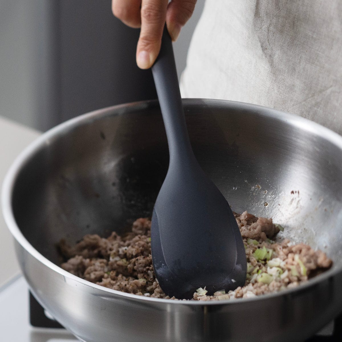 フライパンや鍋肌に沿うスプーン形状と縁を囲うように付いたシリコーンで、残さずすくい取りながら混ぜられます。弾力性のあるシリコーンは、鍋やフライパンを傷つけず安心して使えます。
