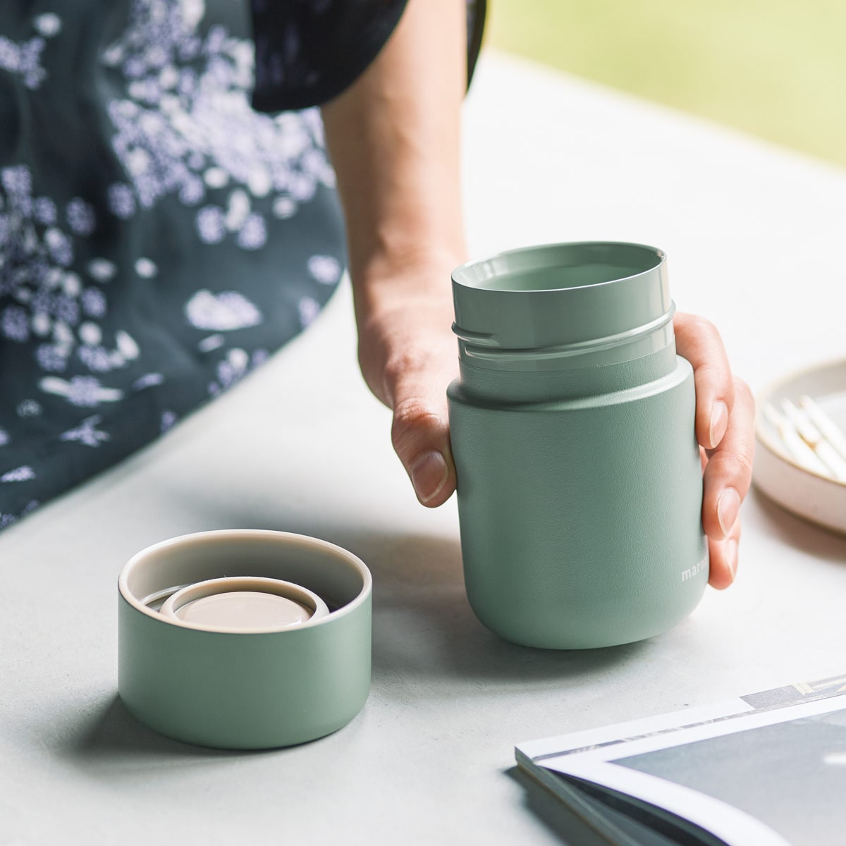 | 材質 | 内びん:ステンレス鋼(セラミック塗装加工) 胴部:ステンレス鋼(セラミック塗装加工・粉体塗装加工) フタ(外側):ステンレス鋼(粉体塗装加工) フタ(内側):ポリプロピレン パッキン・底クッション:シリコーンゴム |