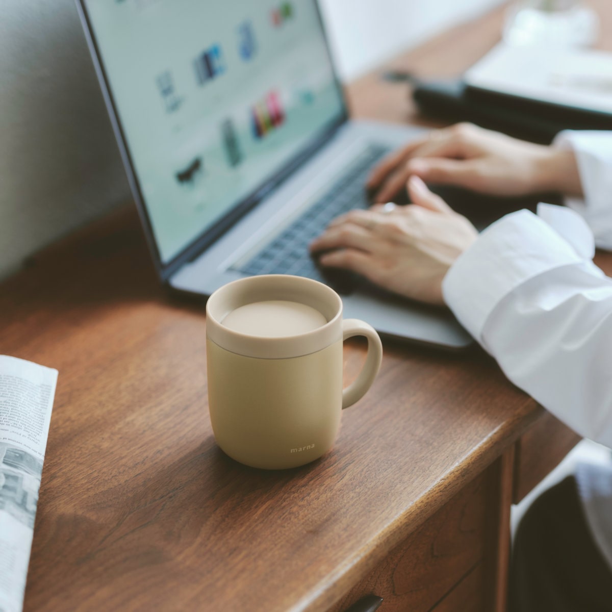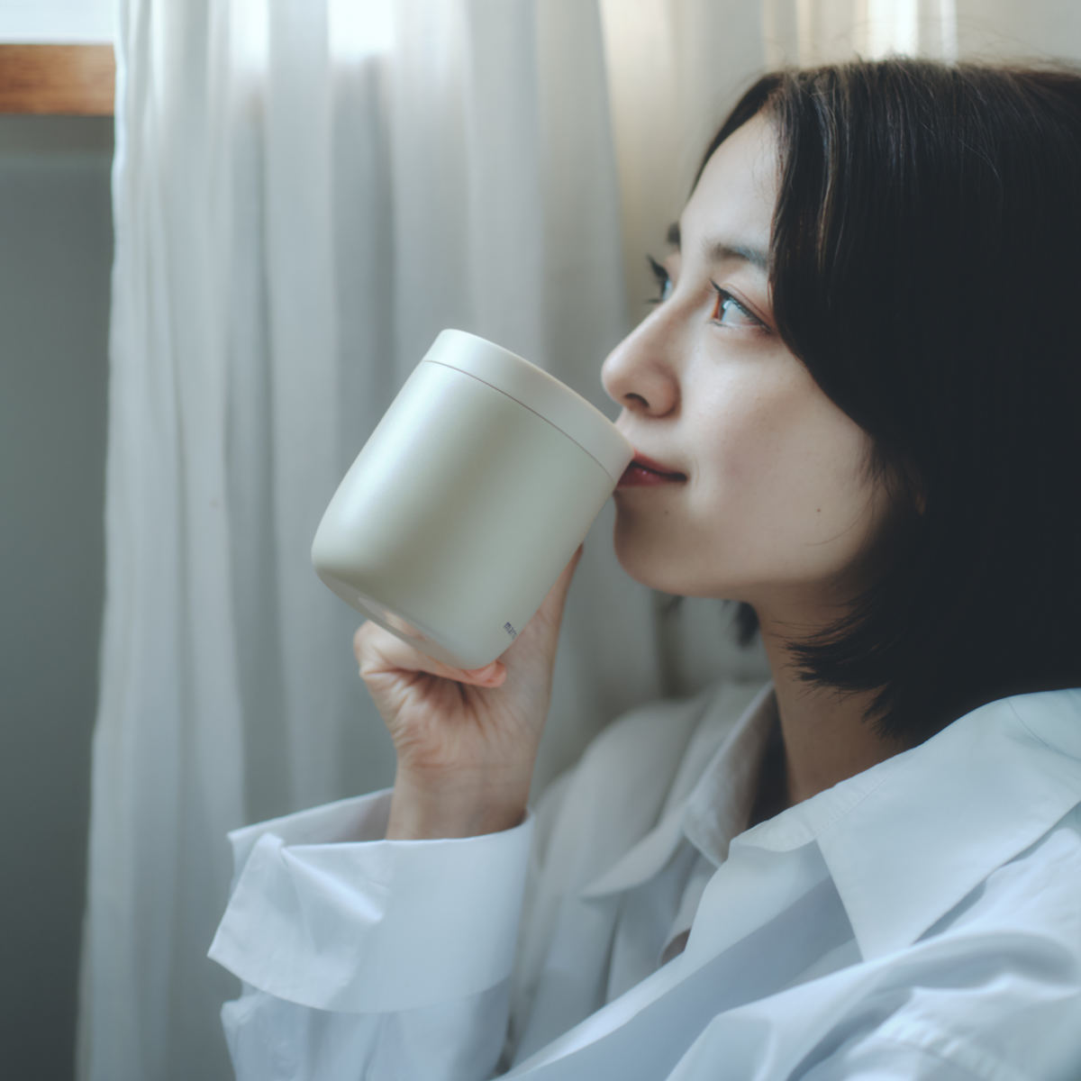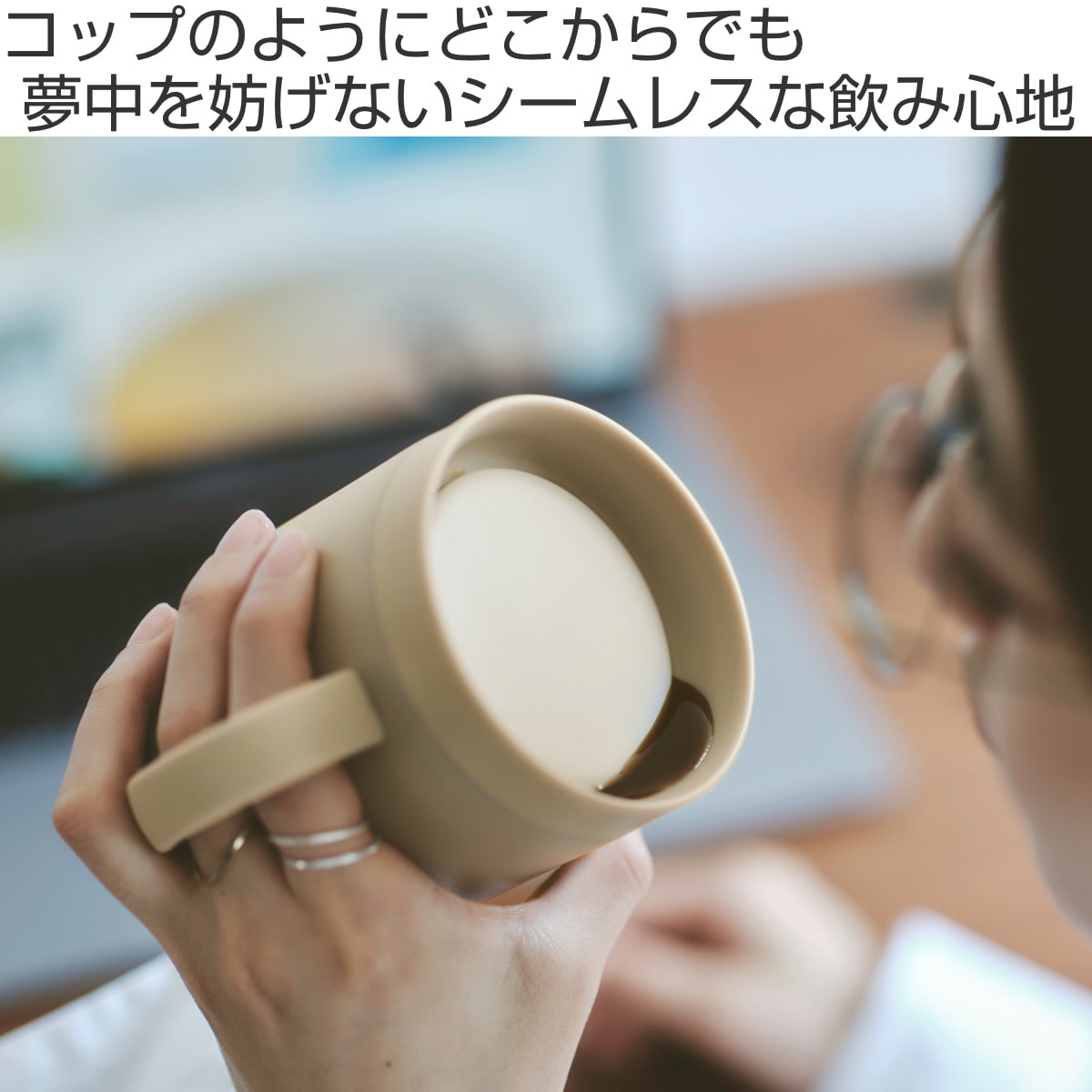 フタをしたまま、360度どこからでも飲めるマグカップです。飲むたびにフタの開閉が不要だから仕事や勉強、読書をしながらでも飲みものをおいしく愉しめます。