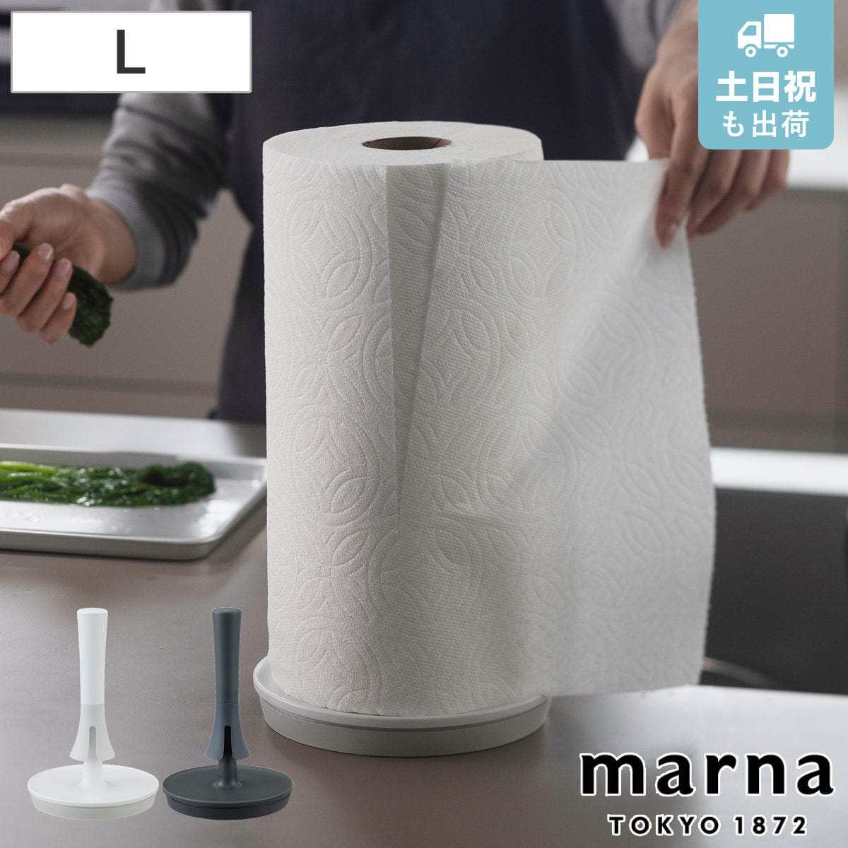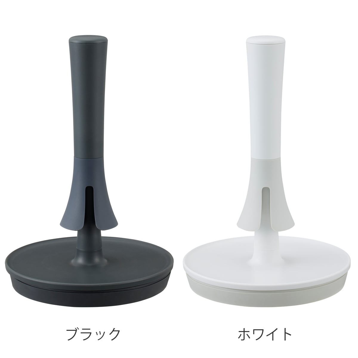 キッチンに合わせて「ホワイト」と「ブラック」の2色からお選びいただけます。サイズは、一般的なキッチンペーパーに合う「Mサイズ」と海外のキッチンペーパーにも対応可能な「Lサイズ」の2サイズ展開です。