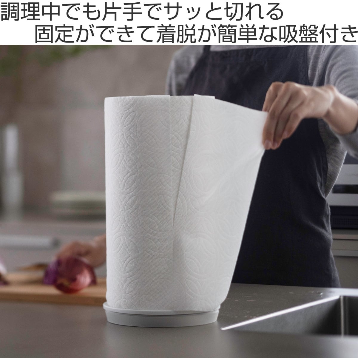 しっかり固定ができて触れるだけで外せるフレキシブルな吸盤「REPITA(リピタ)」を採用したキッチンペーパーホルダーです。吸盤があることで自立して、引き出すのも切り取るのも、全て片手でできます。すぐ手に取れる場所に設置すると料理中に頼りになるアイテムです。