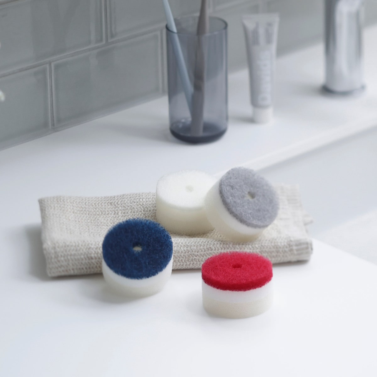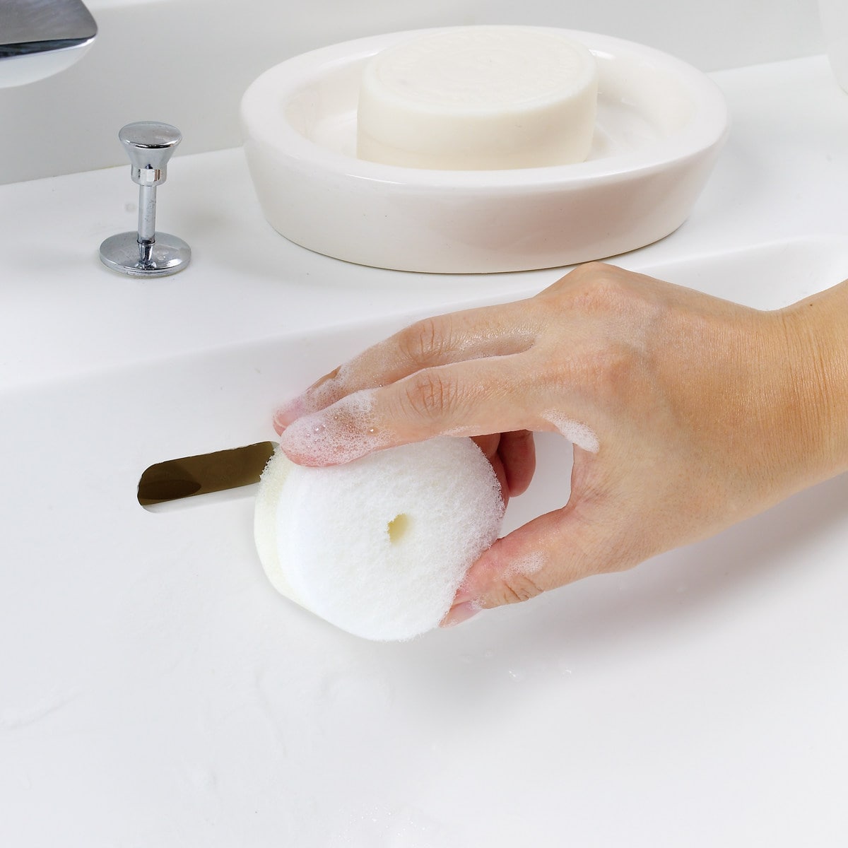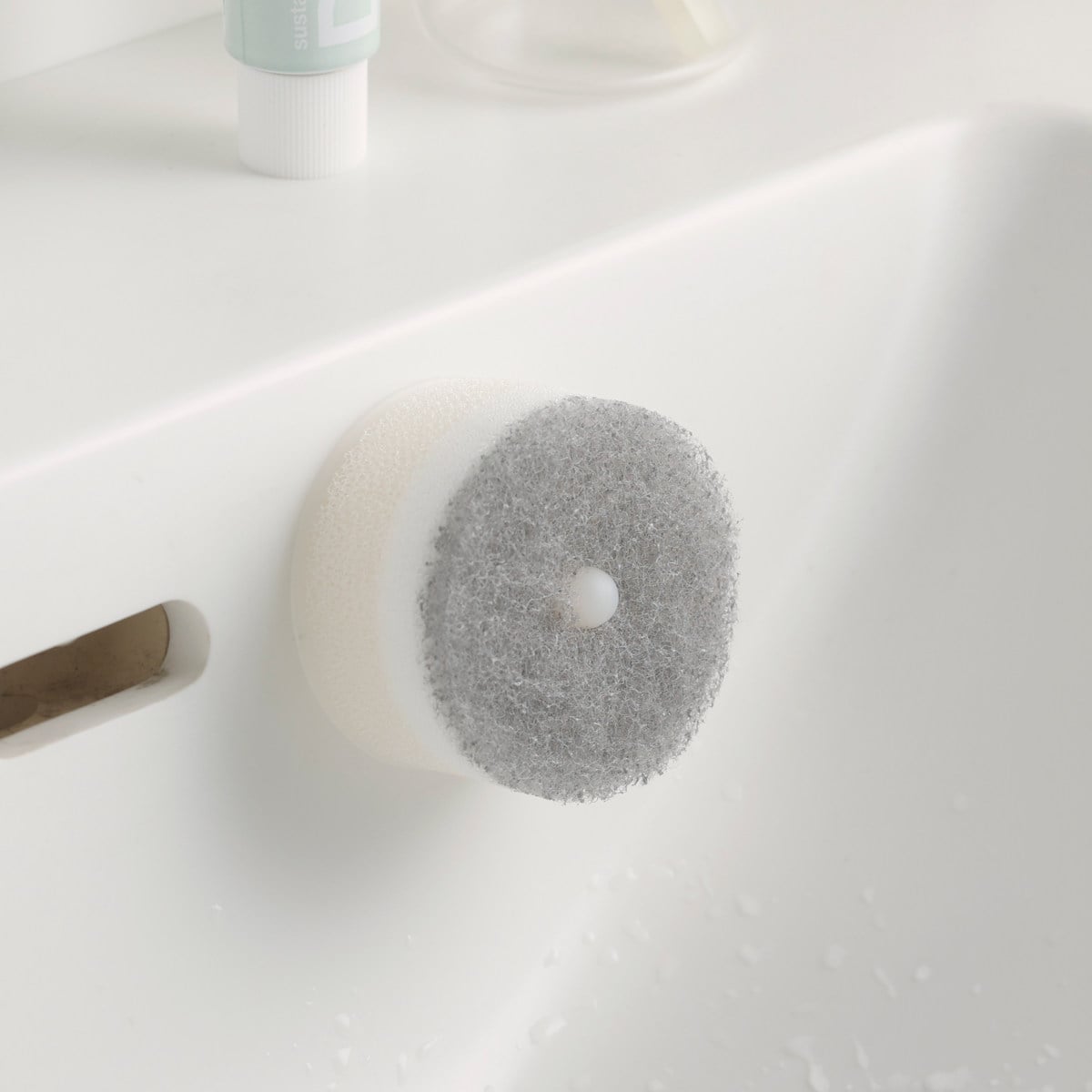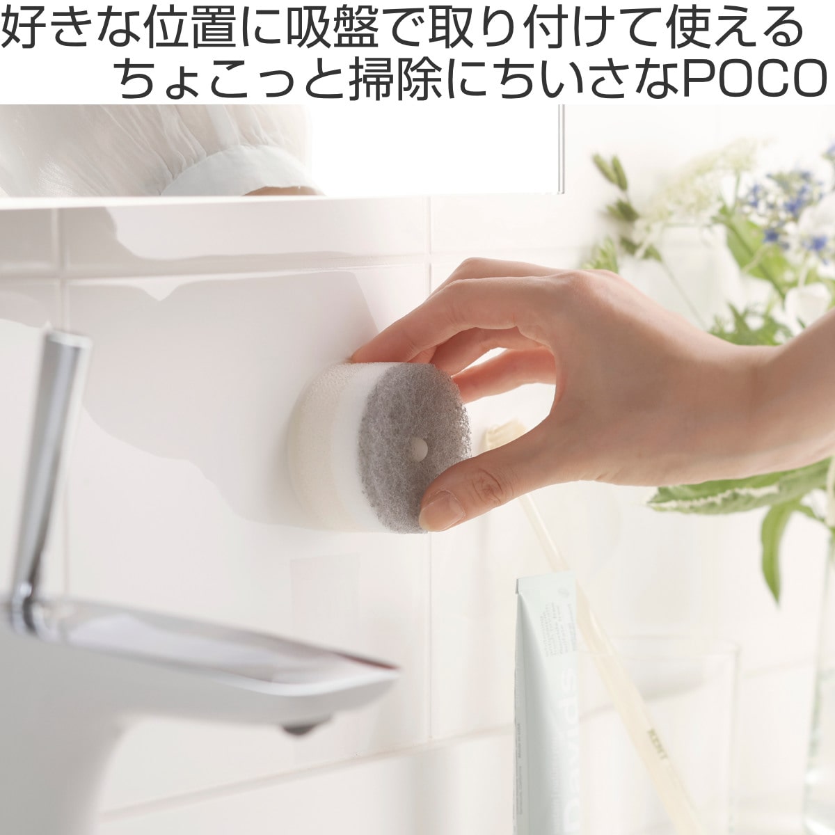 手洗い、うがい、歯みがき、洗顔など1日に何度も使う洗面台。気になる汚れを見つけたらサッと拭き取って、洗い流した後はパパッと片付けられる「洗面スポンジPOCO吸盤付き」の替えスポンジ2個入りです。