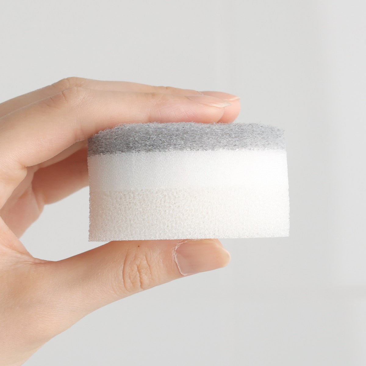水垢落としに役立つ「ナイロン不織布層」、洗剤をしっかりキープする「ウレタン層」、少量の洗剤でもたっぷり泡立ち、水切りすっきりの「脱膜ウレタン層」の3層構造です。抜群の泡立ちと泡持ちで汚れが落としやすく、水垢もしっかりと絡め取ります。