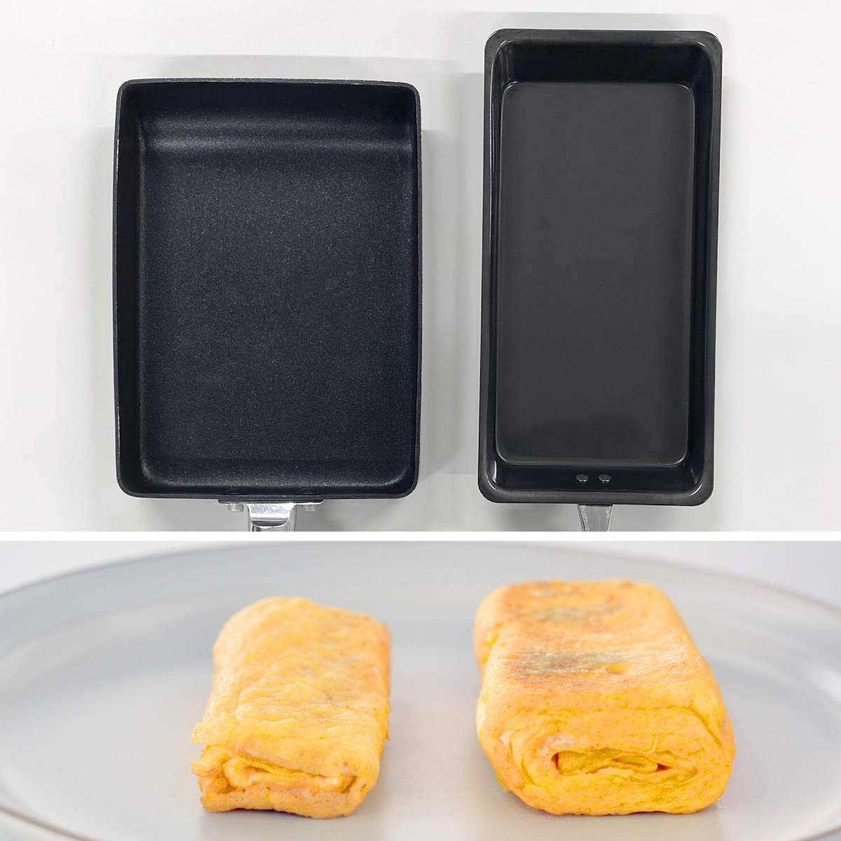 一般的な卵焼き器で卵1個で卵焼きを作った結果、本品の方が厚くふっくらと仕上がりました。